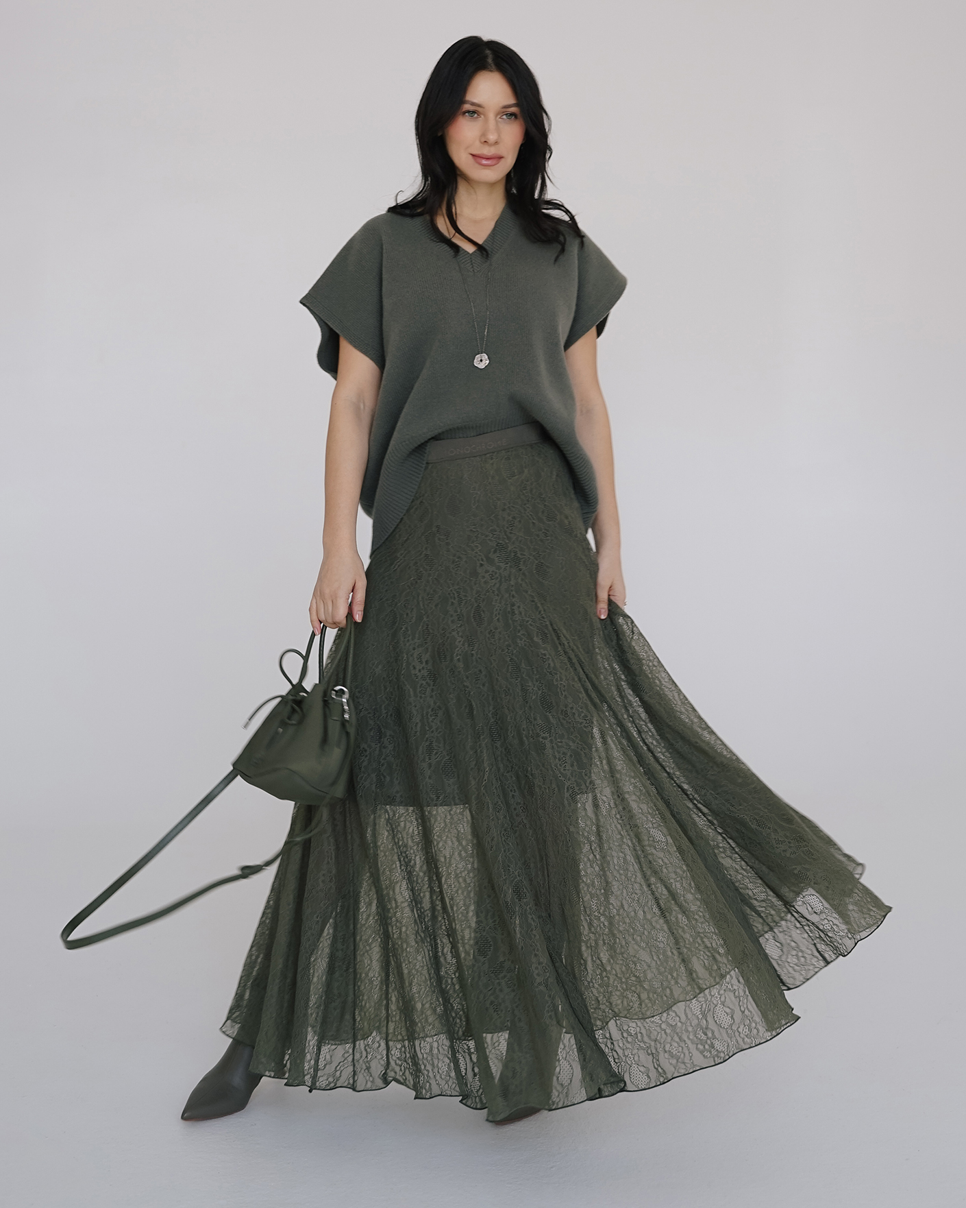 Юбка полусолнце Marella оливкового цвета в кружевной рисунок. Модель высокой посадки, длина макси. Юбка отлично впишется в ваш гардероб.