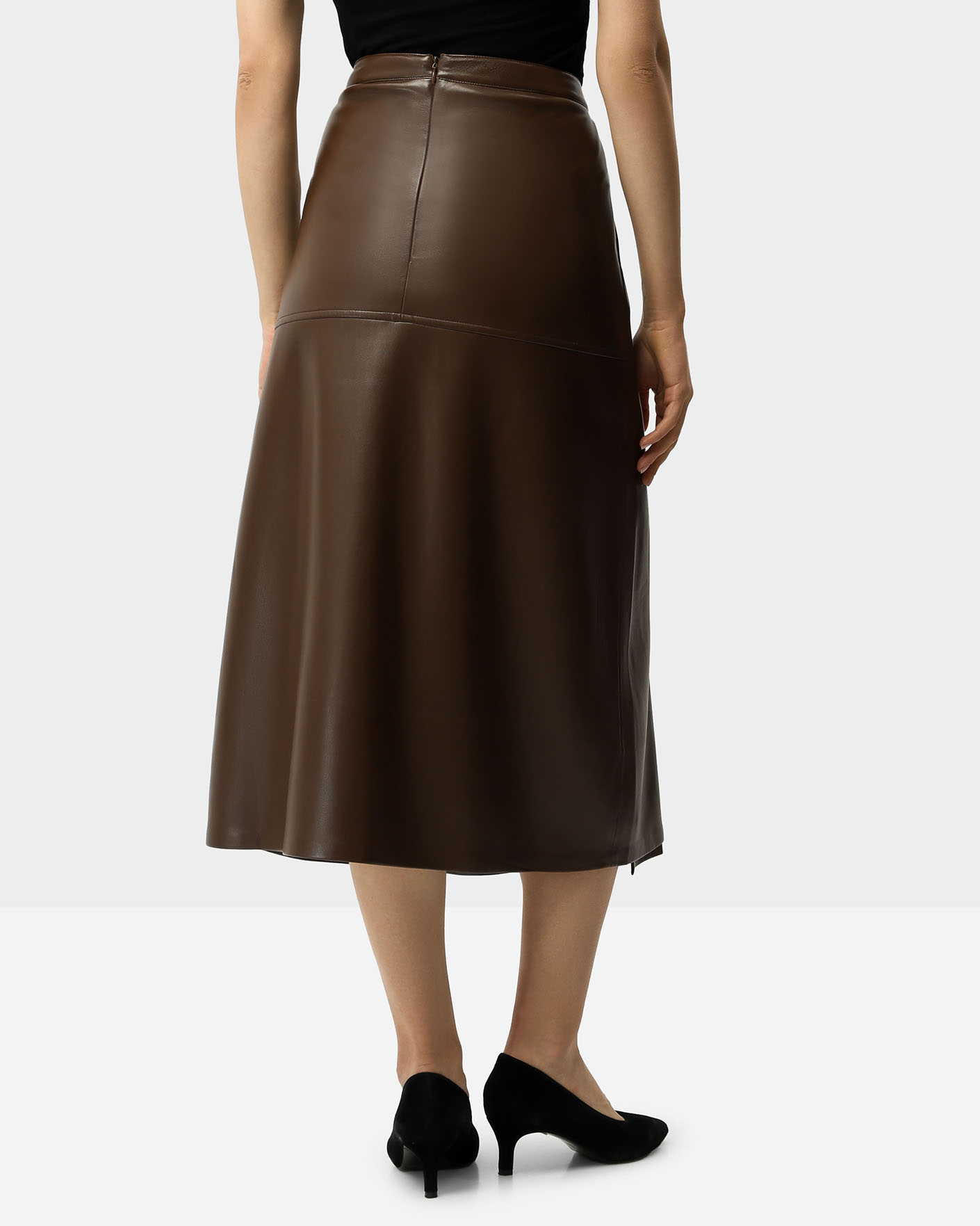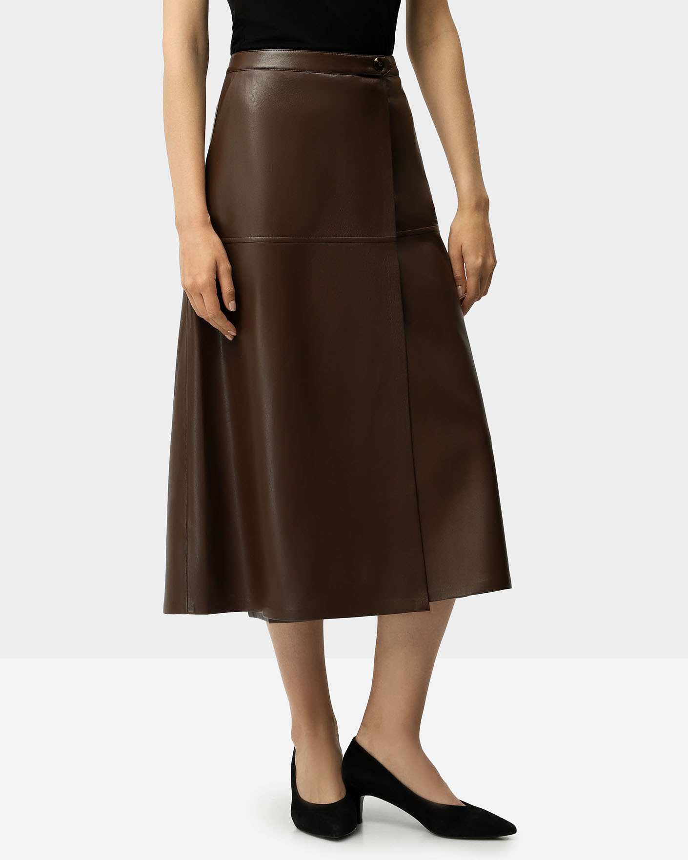 Юбка-трапеция UNQ коричневого цвета с покрытием. Модель высокой посадки, на запахе с застежкой на пуговицу. Длина миди. Юбка-трапеция отлично сочетается с любым гардеробом.