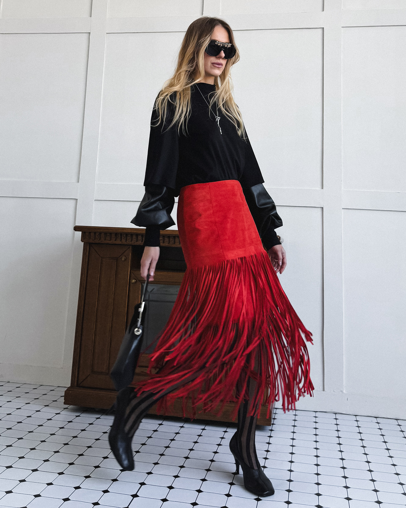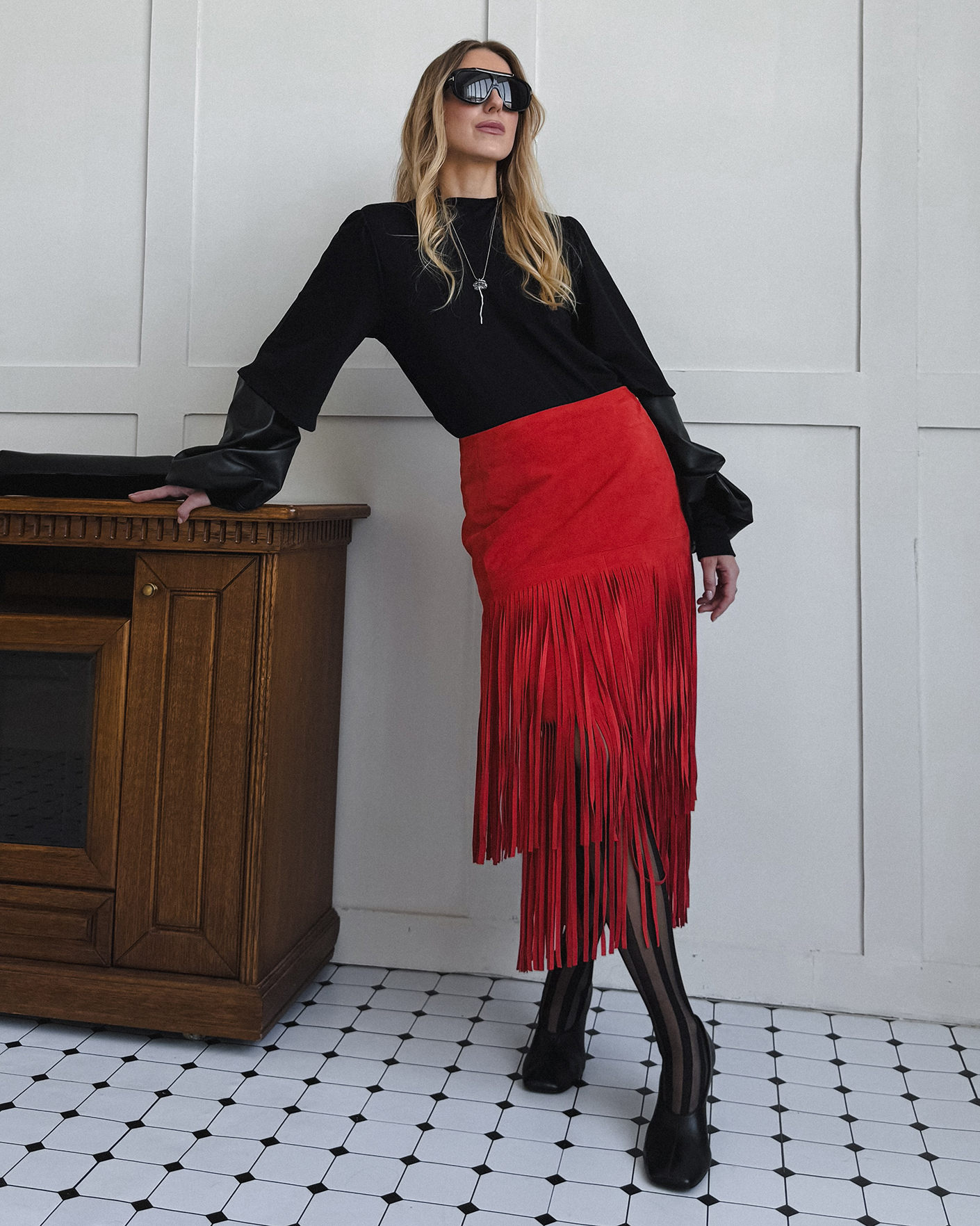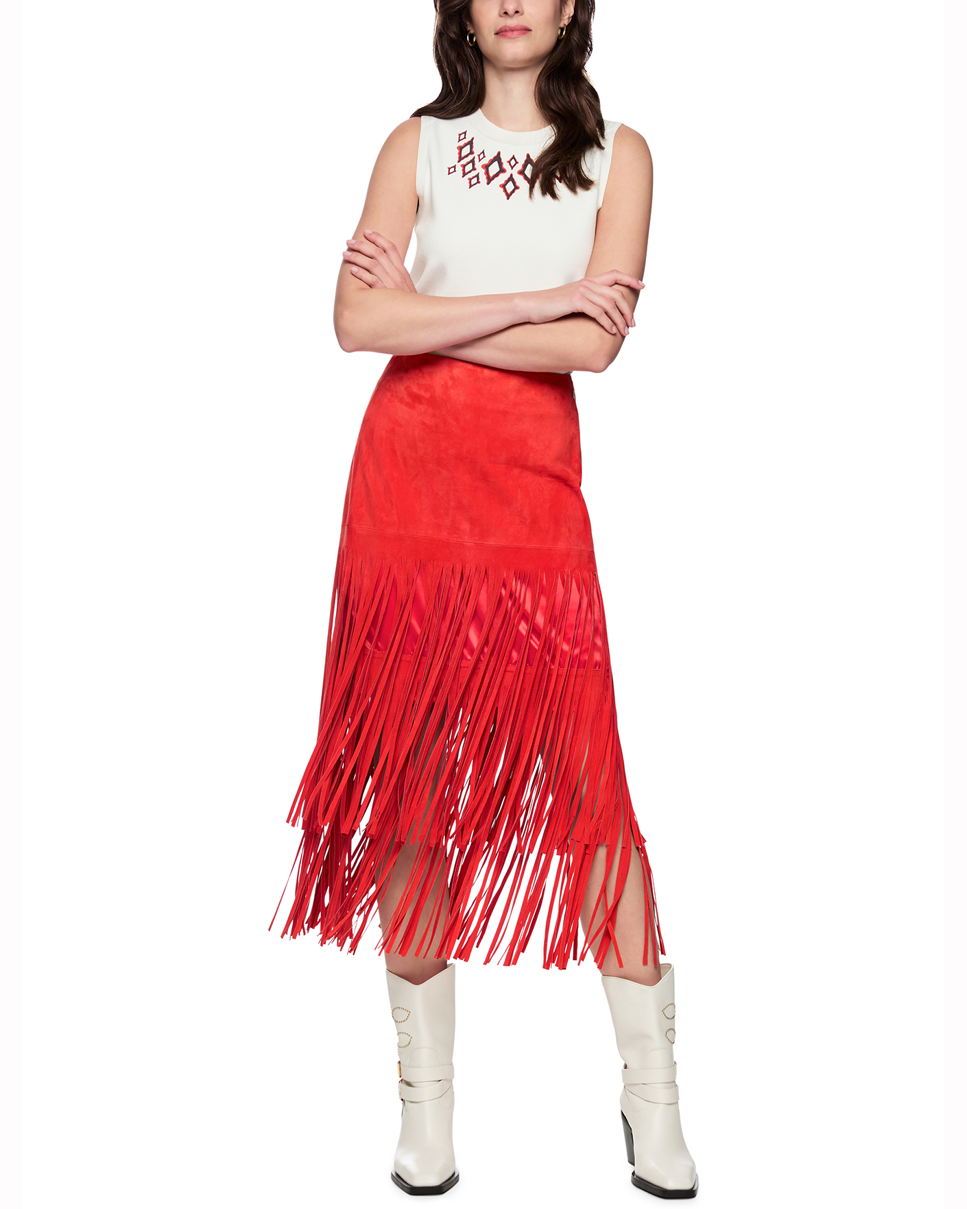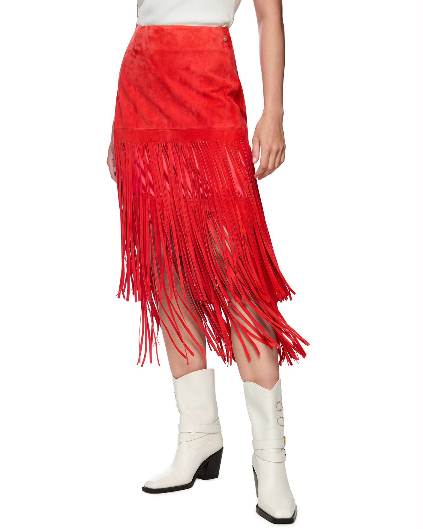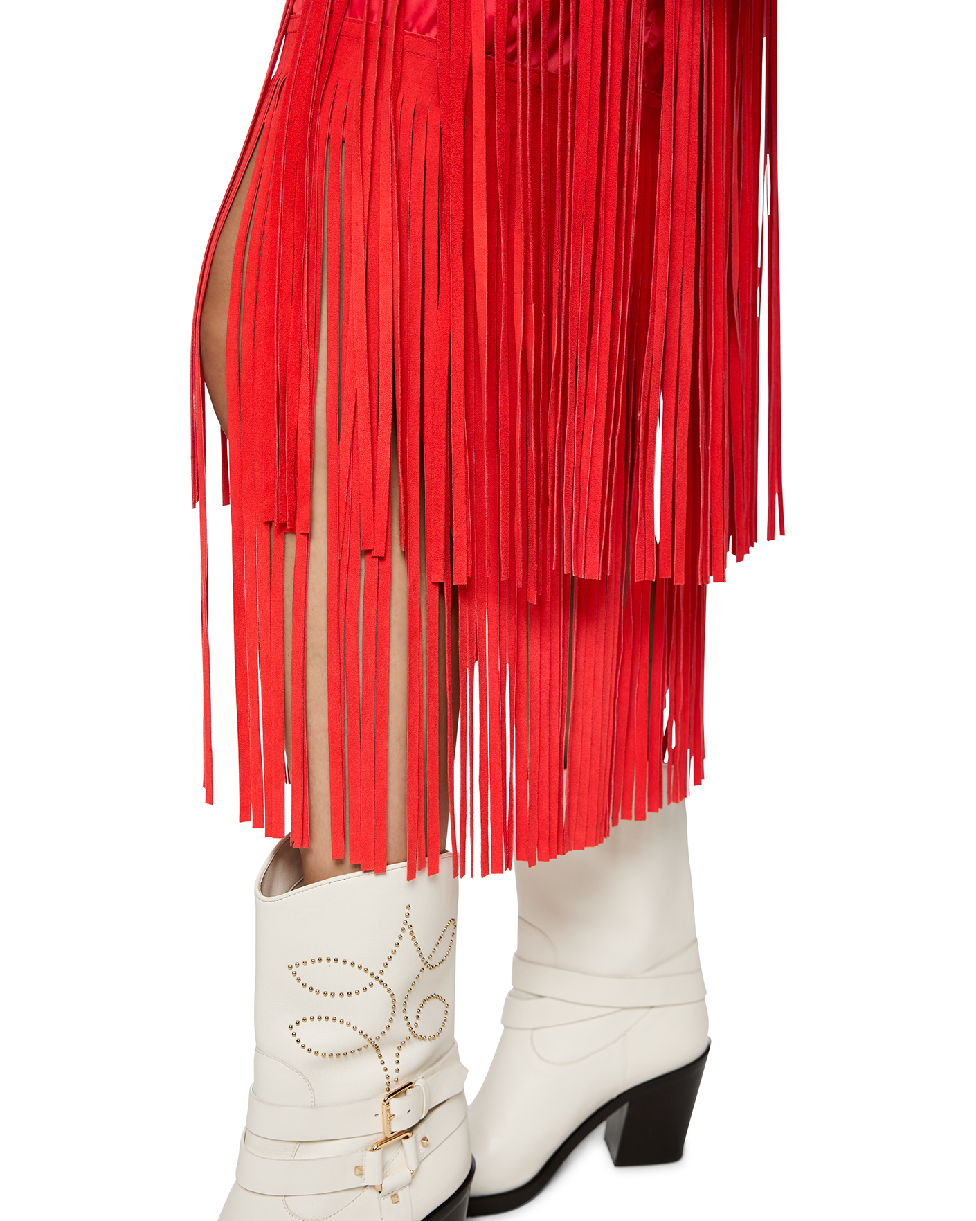 Юбка-карандаш Marc Cain Collection алого цвета с декором в виде бахромы. Модель из 100% кожи, с высокой посадкой, застежка на молнию сзади, длина миди. Идеальная юбка-карандаш станет фаворитом вашего гардероба.