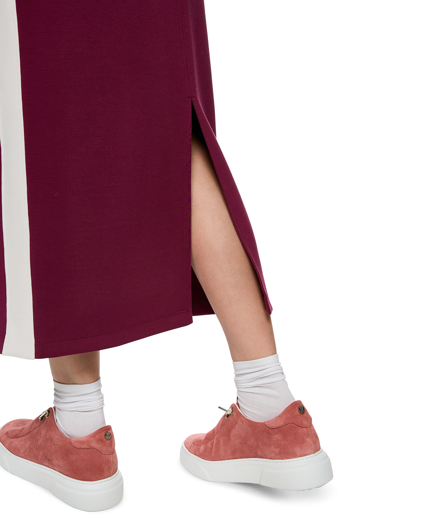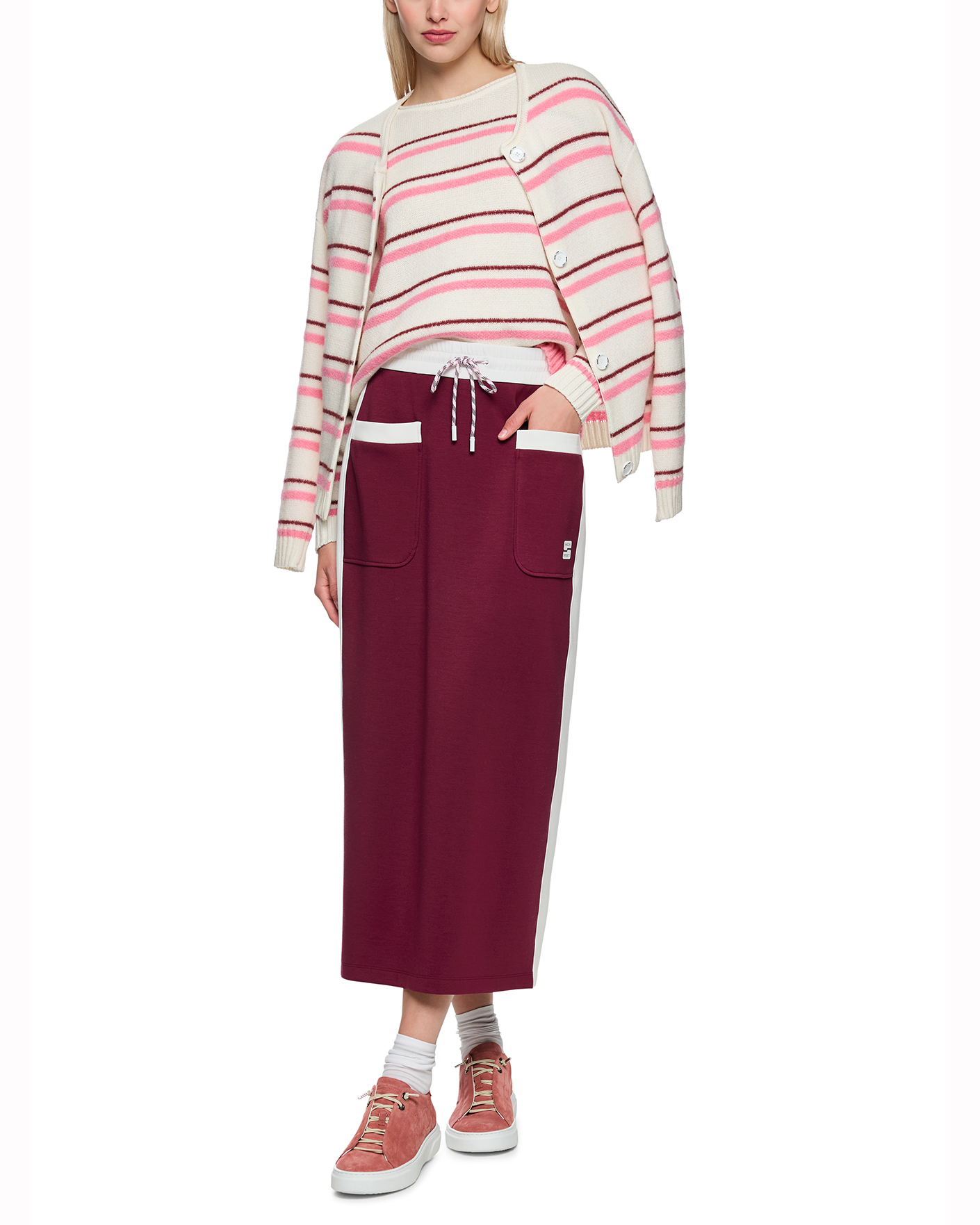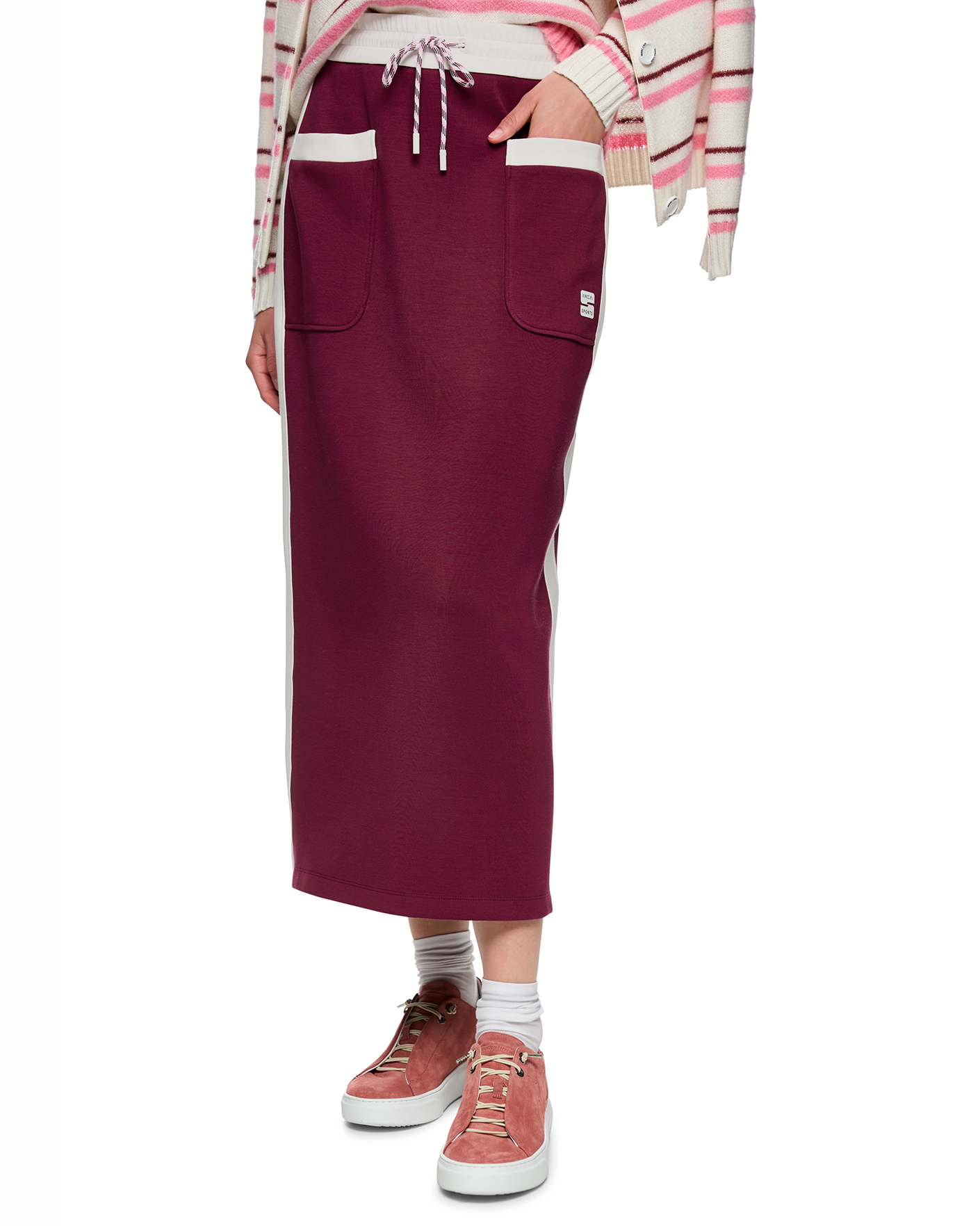 Юбка-карандаш Marc Cain Sport вишневого цвета с широкими лампасами. Модель высокой посадки на эластичном поясе со вставным шнурком, накладные карманы по бокам, длина миди. Юбка-карандаш отлично впишется в гардероб.