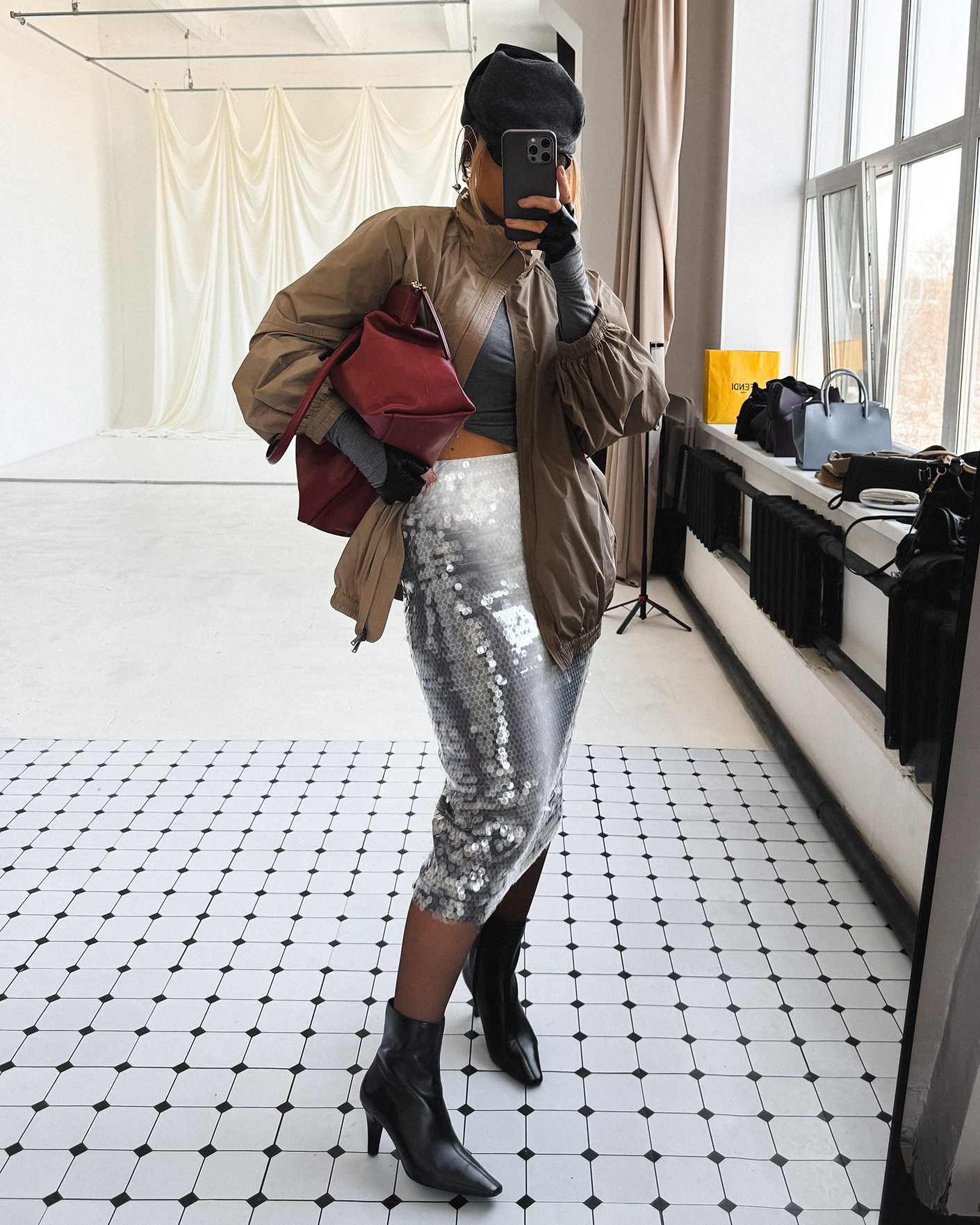 Юбка-карандаш Sportmax серого цвета с крупными пайетками. Модель высокой посадки на эластичном поясе, длина миди. Юбка-карандаш станет фаворитом вашего повседневного и праздничного гардероба.
