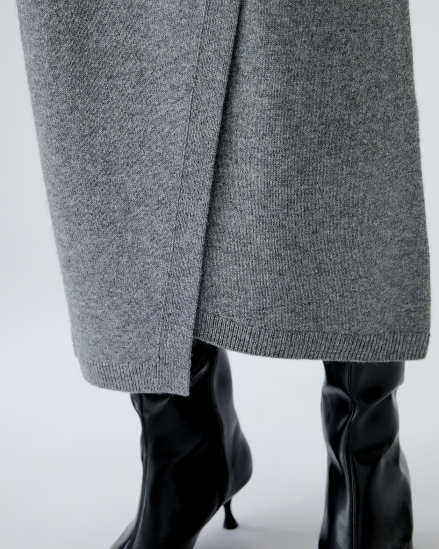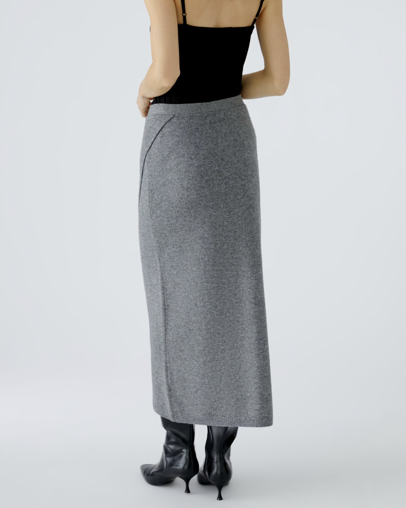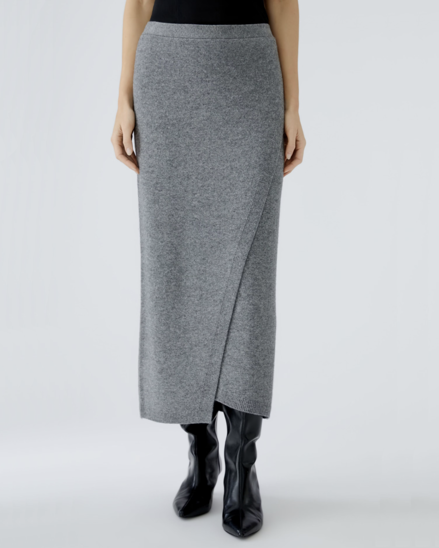 Стильная трикотажная юбка-карандаш OUI серого цвета. Модель высокой посадки на эластичном поясе, а также ассиметричный запах спереди. Юбка-карандаш станет фаворитом вашего гардероба.