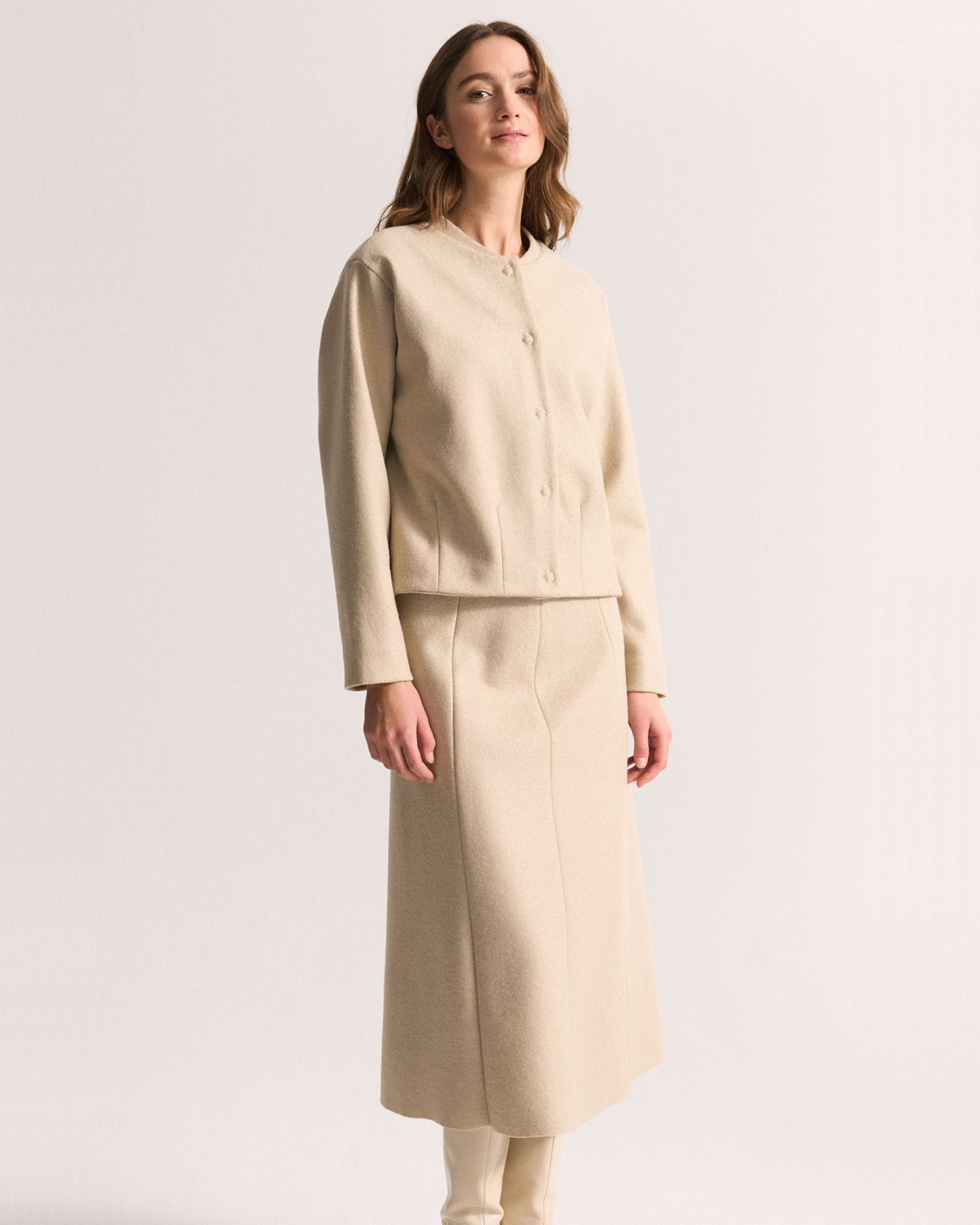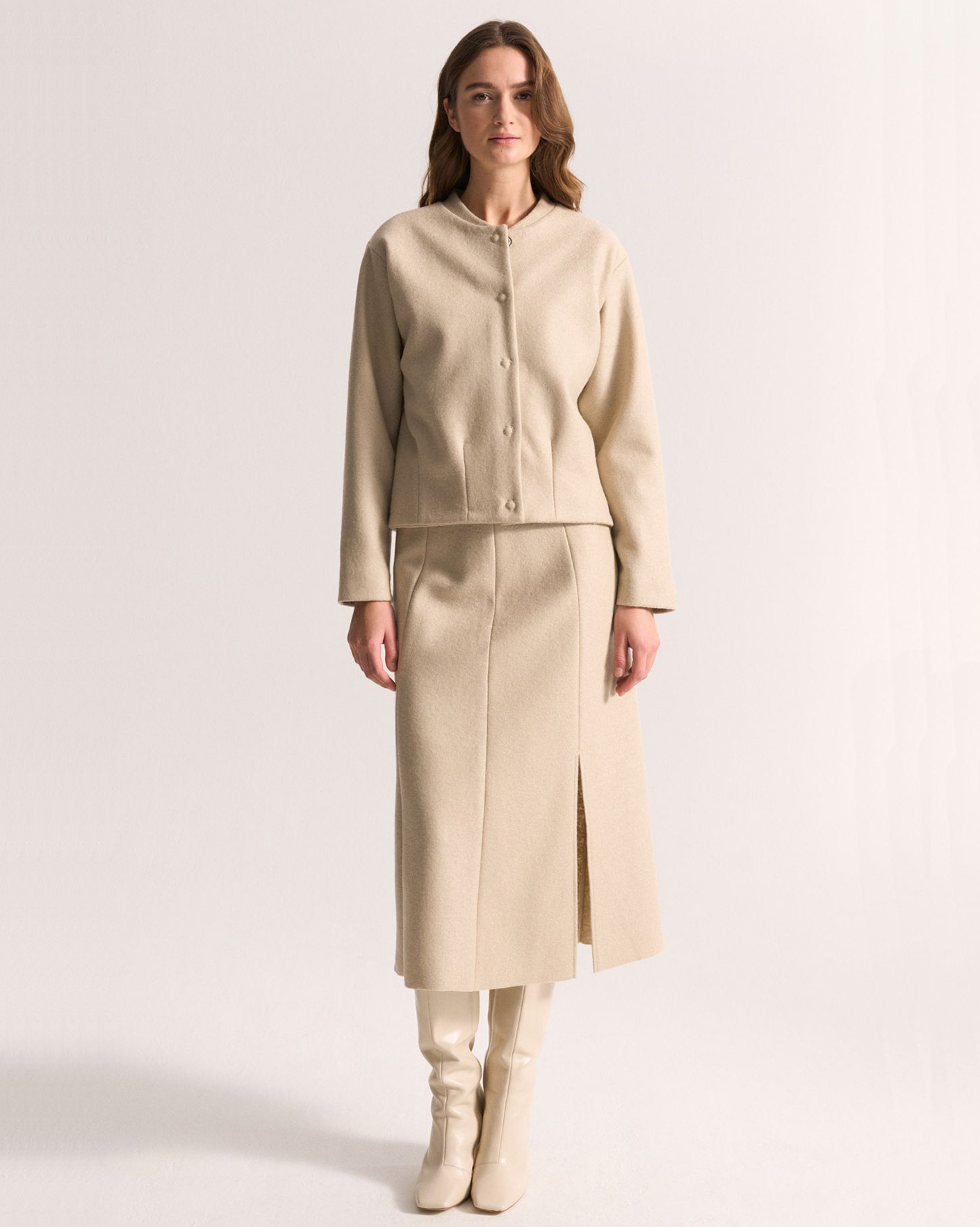 Юбка-трапеция UNQ серо-бежевого цвета в текстурный рисунок. Модель из 100% шерсти, высокая посадка, скрытая застежка, имеется небольшой боковой разрез спереди. Юбка-трапеция отлично сочетается с повседневным гардеробом.