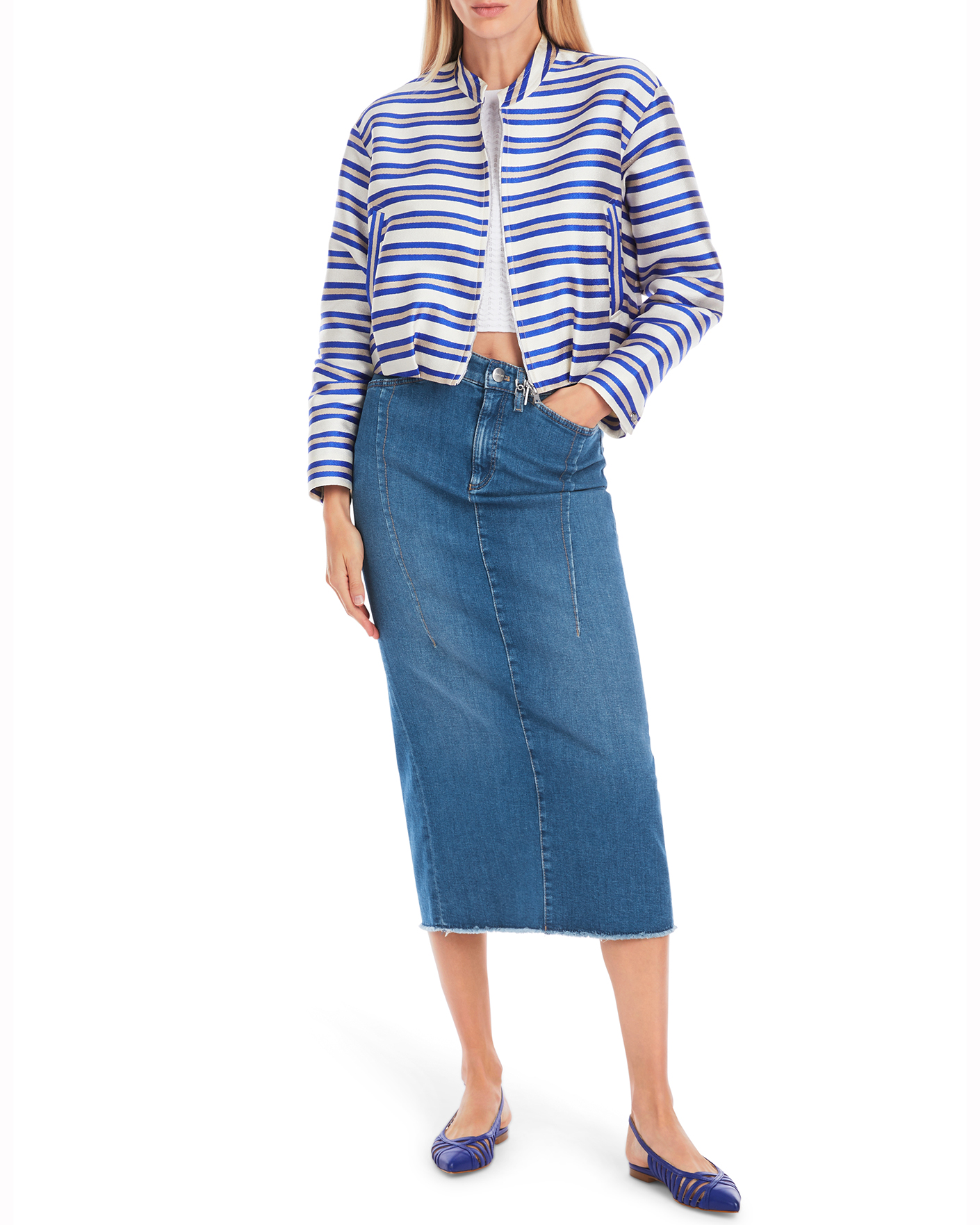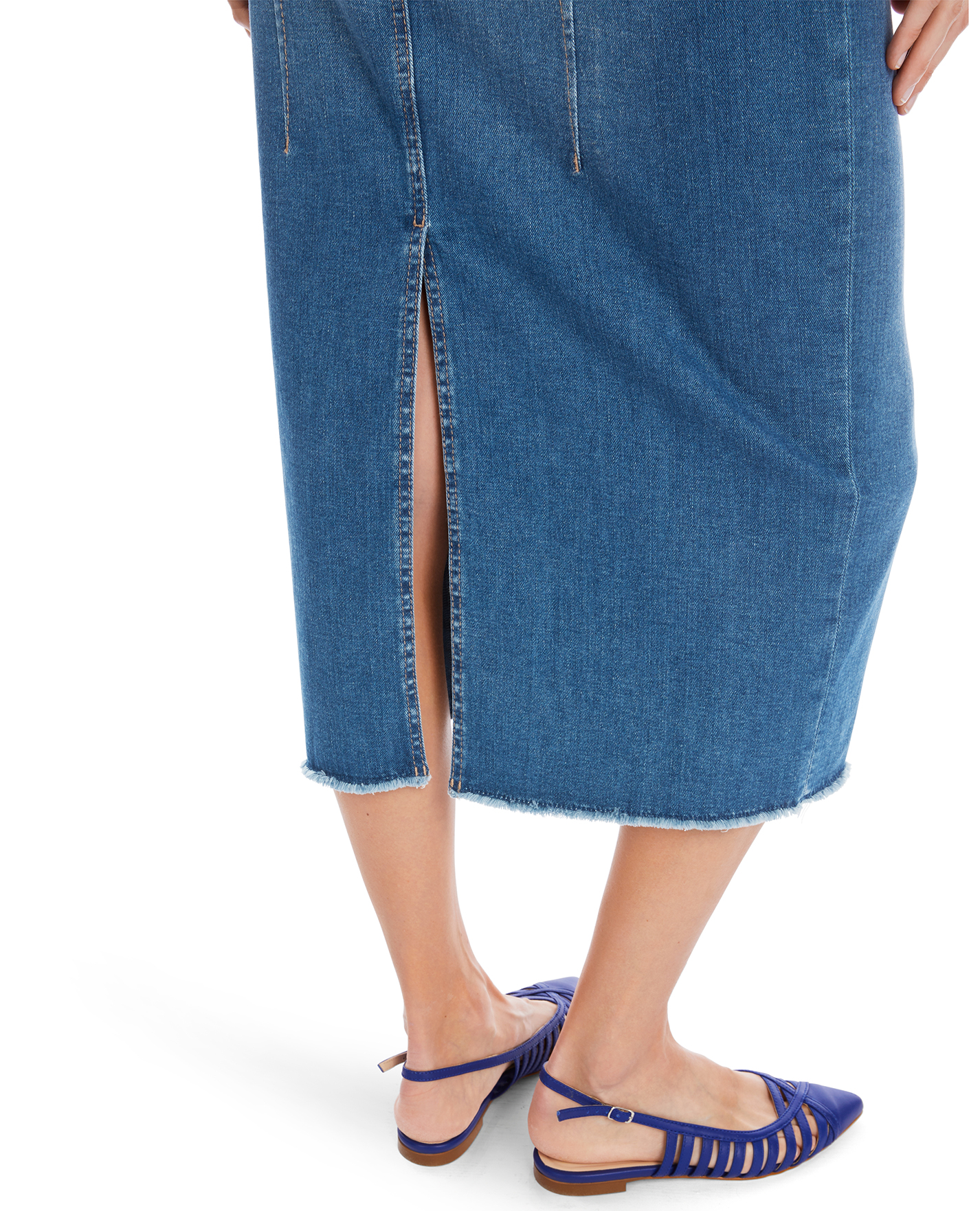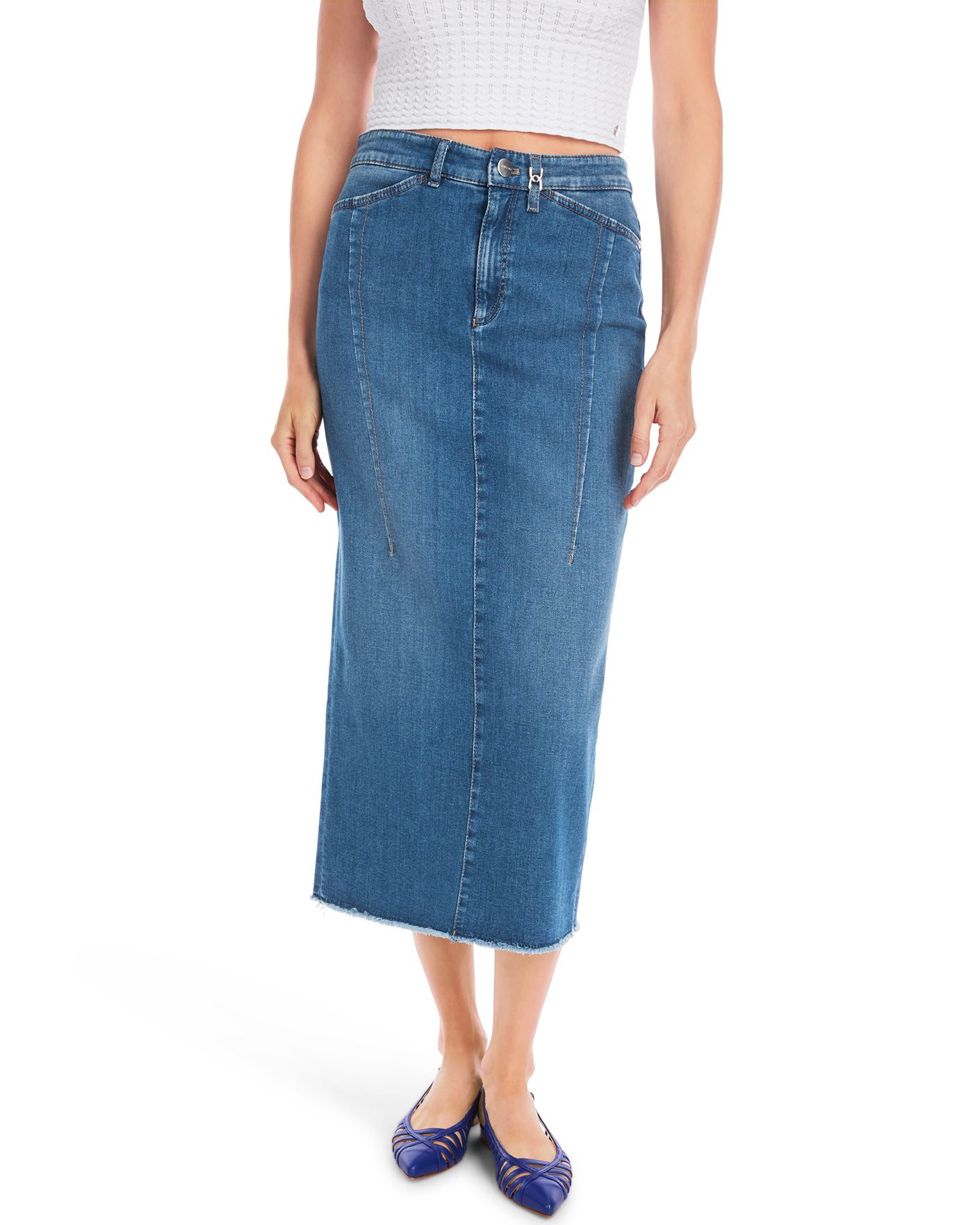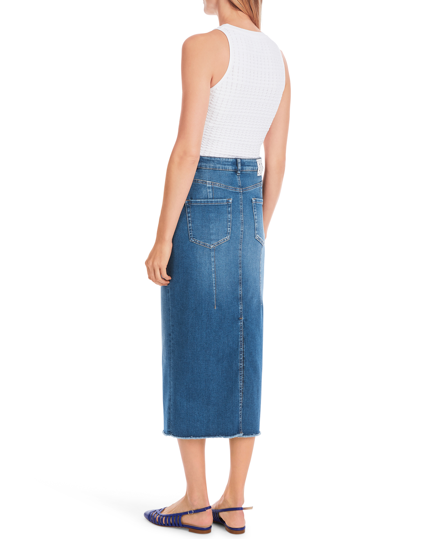 Джинсовая юбка-карандаш Marc Cain Collection темно-голубого цвета. Хлопковая модель высокой посадки на стандартной застежке, врезные карманы по бокам и накладные сзади. Длина миди со специально необработанным краем. Также имеется разрез по центру шва сзади. Юбка-карандаш - идеальный выбор для повседневного образа.