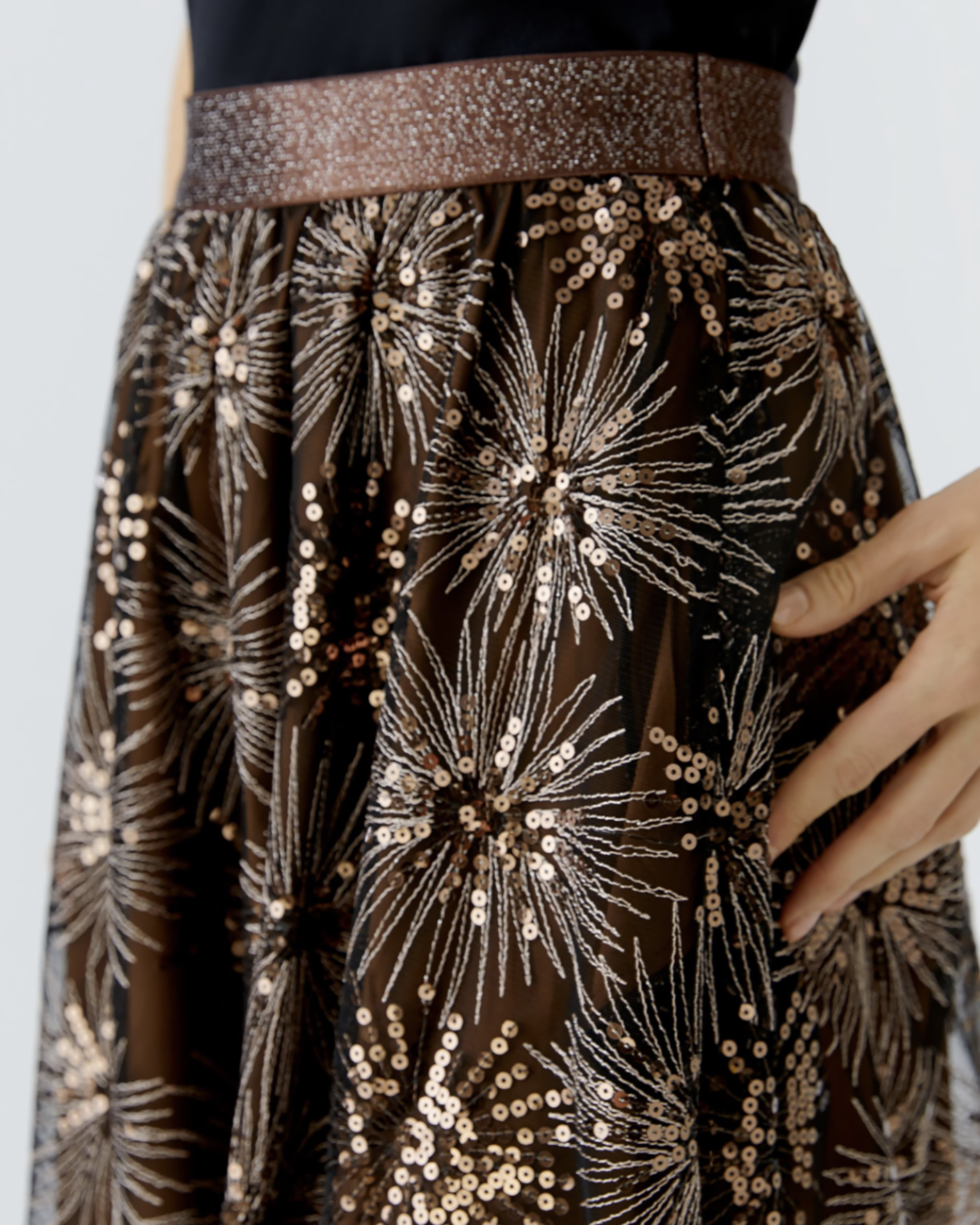 Стильная двухслойная юбка-колокол OUI коричневого цвета с декором в виде пайеток. Модель на эластичном поясе, что обеспечивает комфортную посадку. Длина миди. Стильная юбка-колокол станет фаворитом на каждый день.