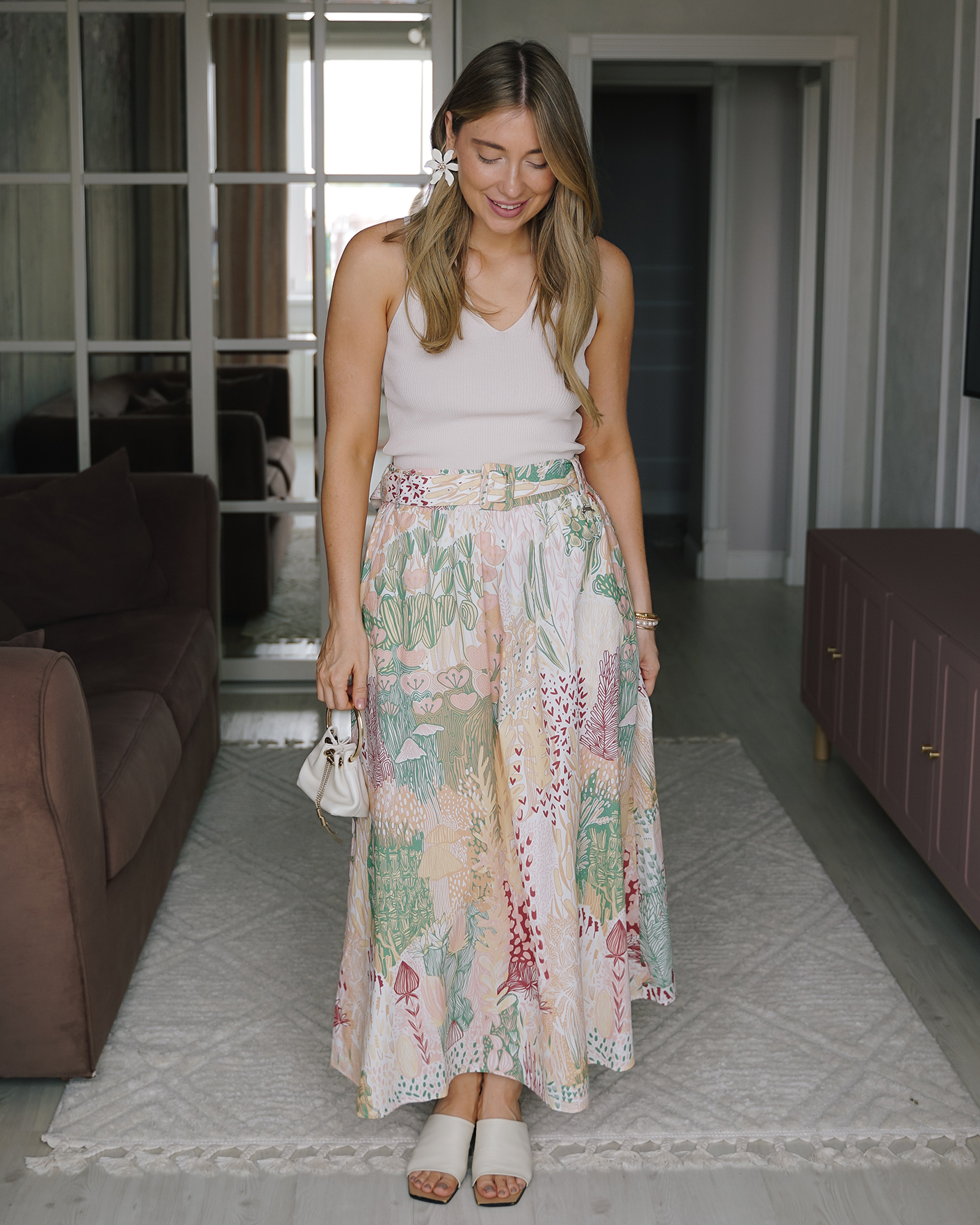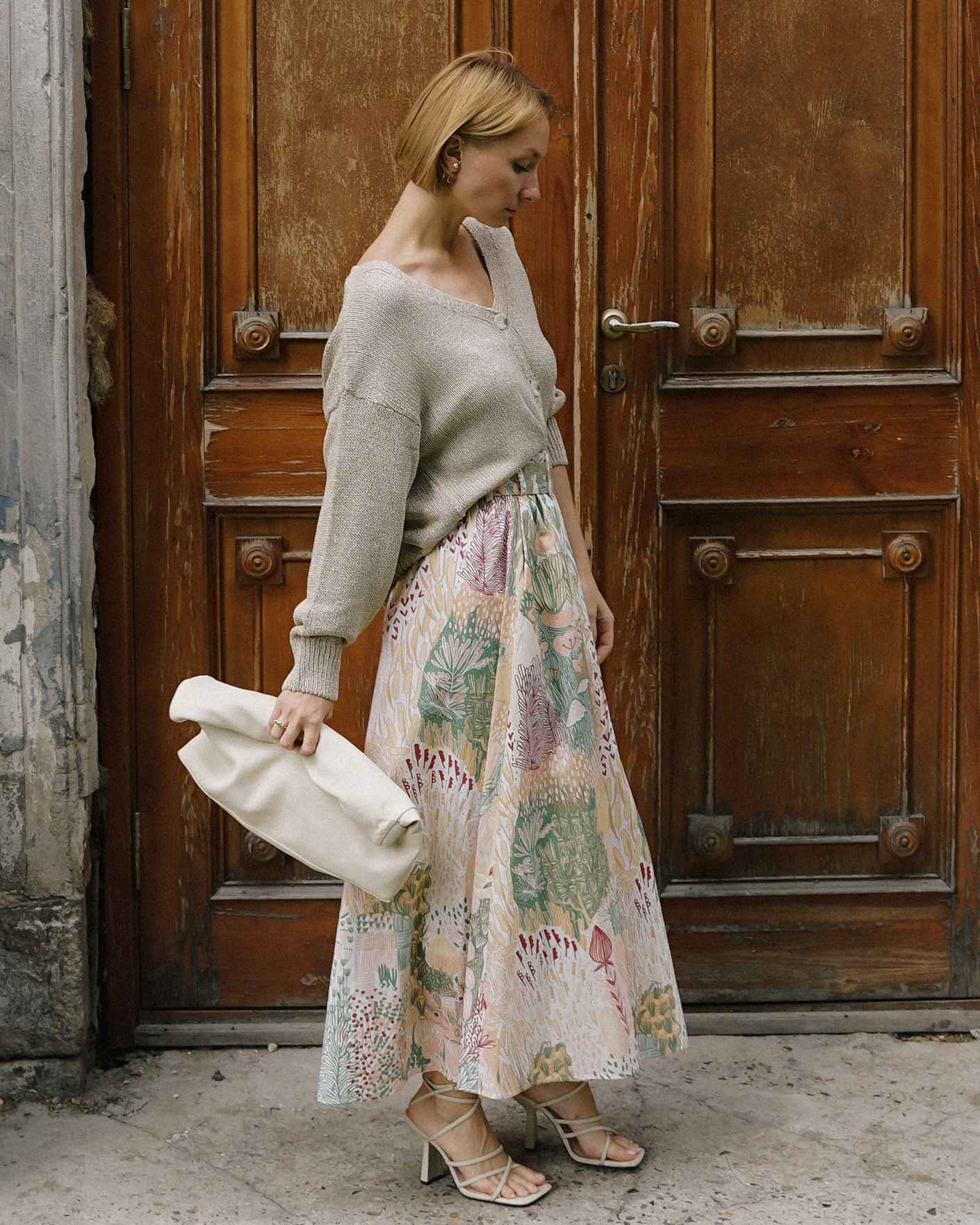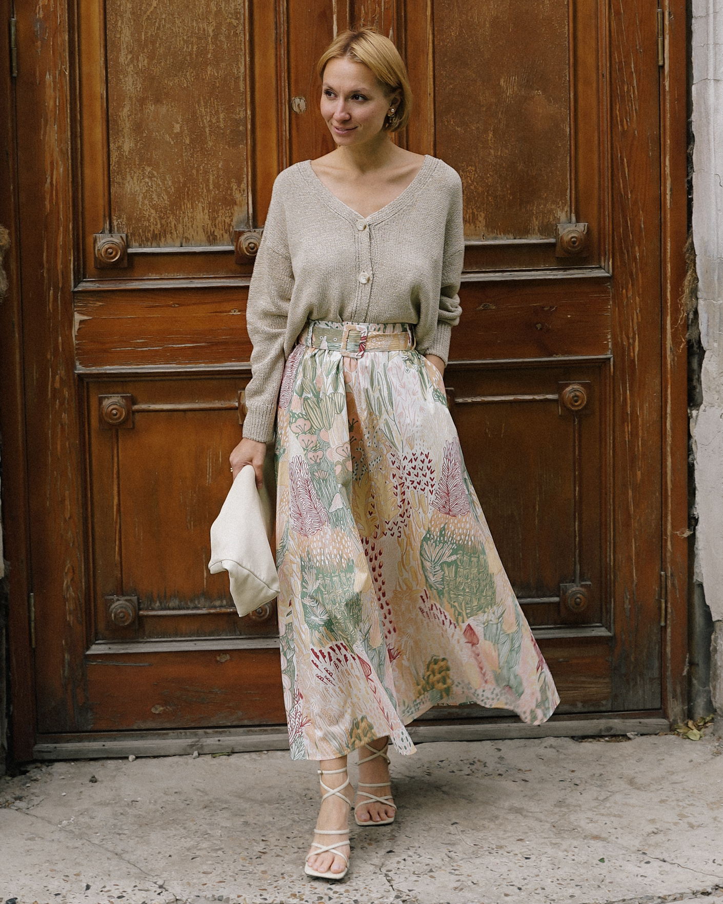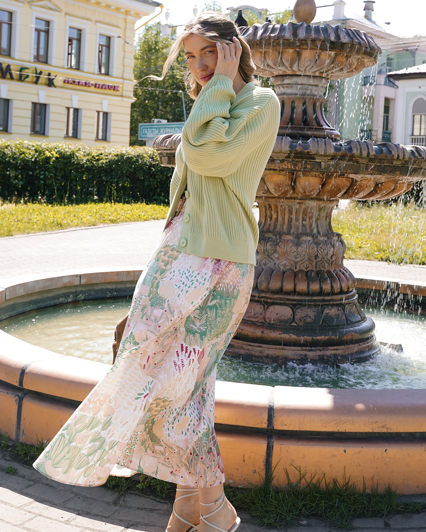 Юбка Akhmadullina Dreams бежево-зеленого цвета в цветочный рисунок. Модель из 100%, А-силуэта, высокая посадка дополнена широким поясом в тон, застежка на молнию. Идеальная юбка для летних образов.