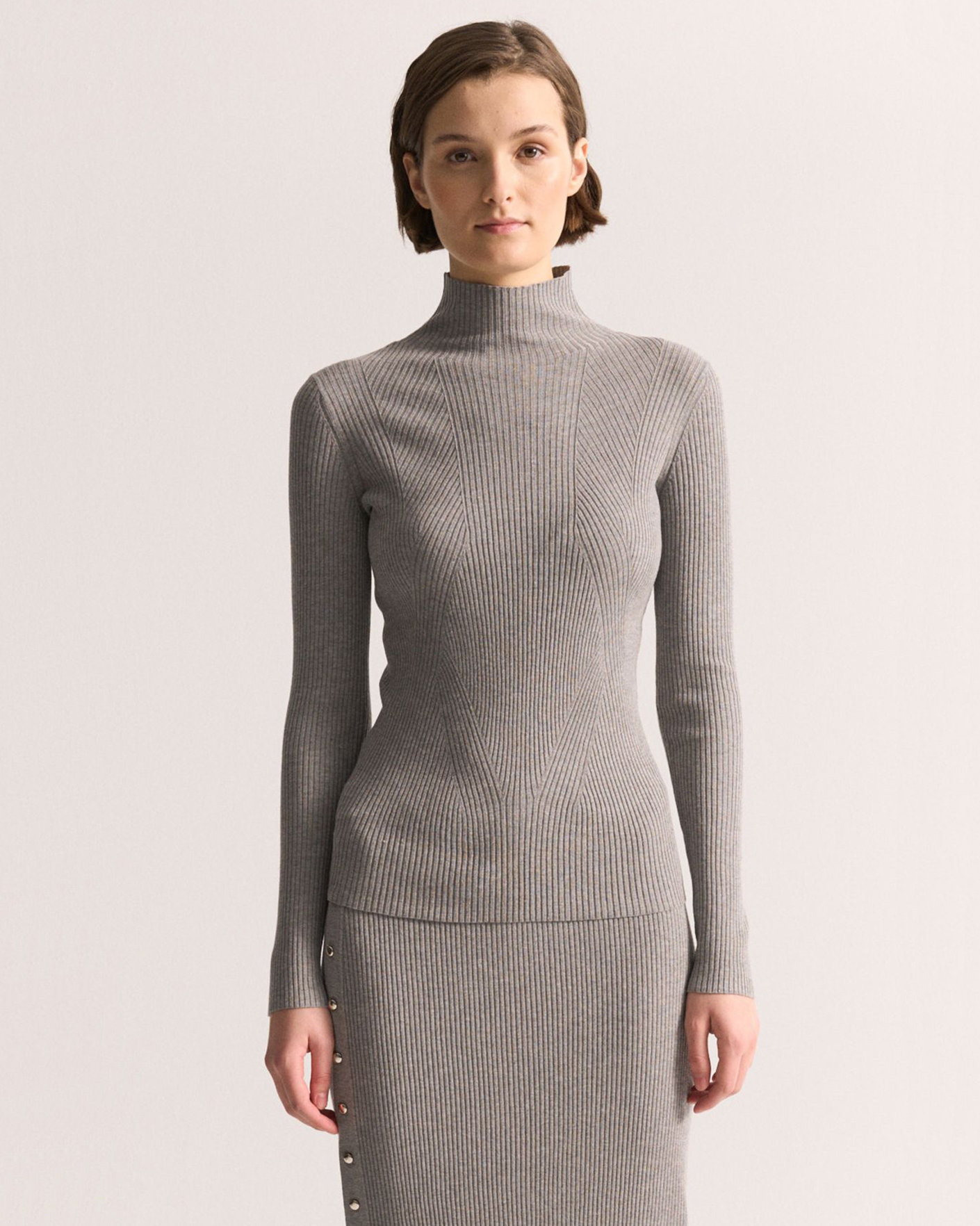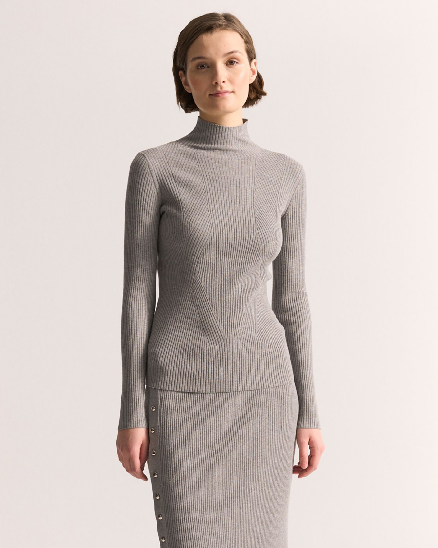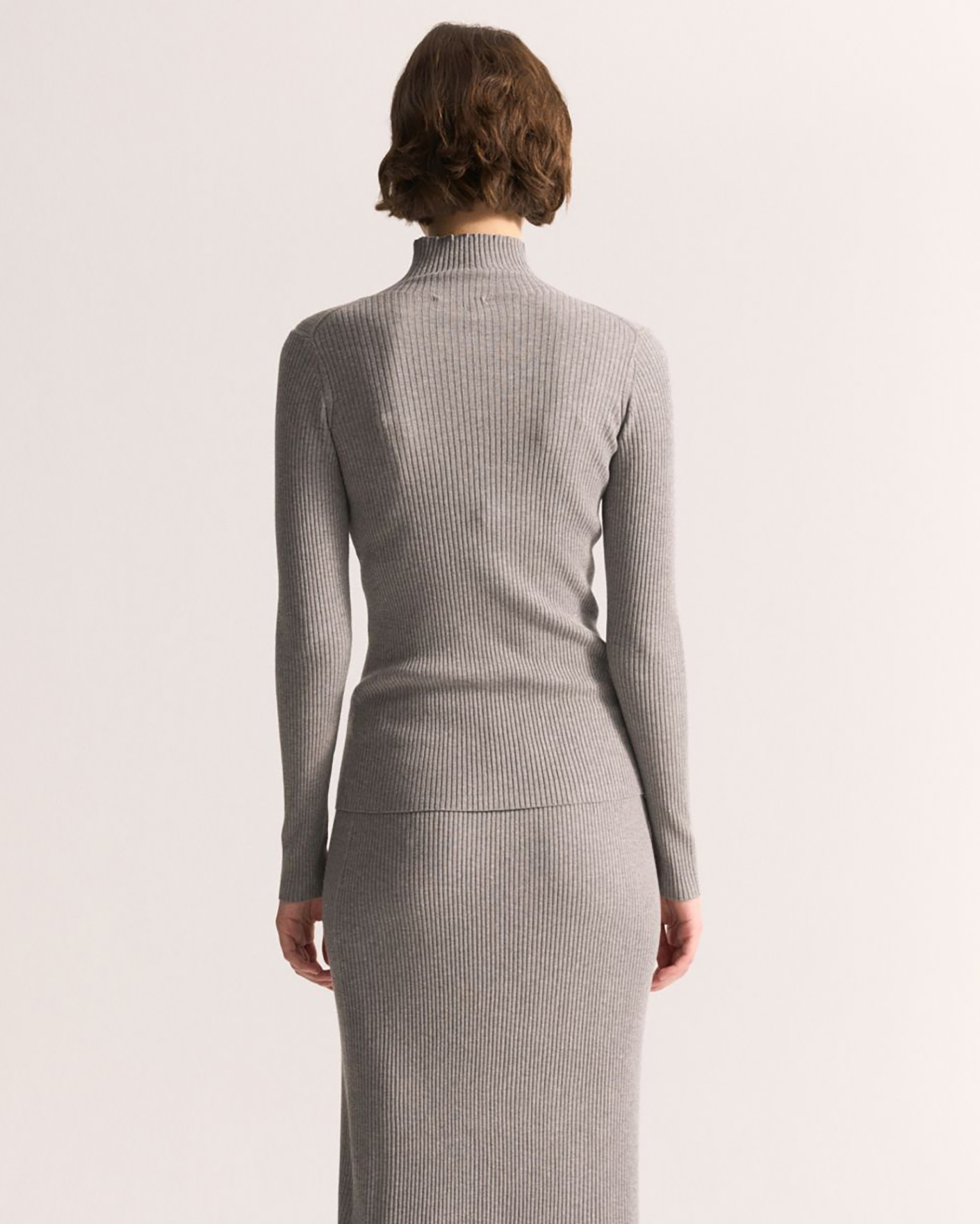 Приталенная водолазка UNQ серого цвета в вертикальную вязку-резинка. Модель с воротником-стойка и длинными рукавами. Водолазку можно сочетать с жилетом, жакетом, платьем, юбкой, кардиганом, брюками.