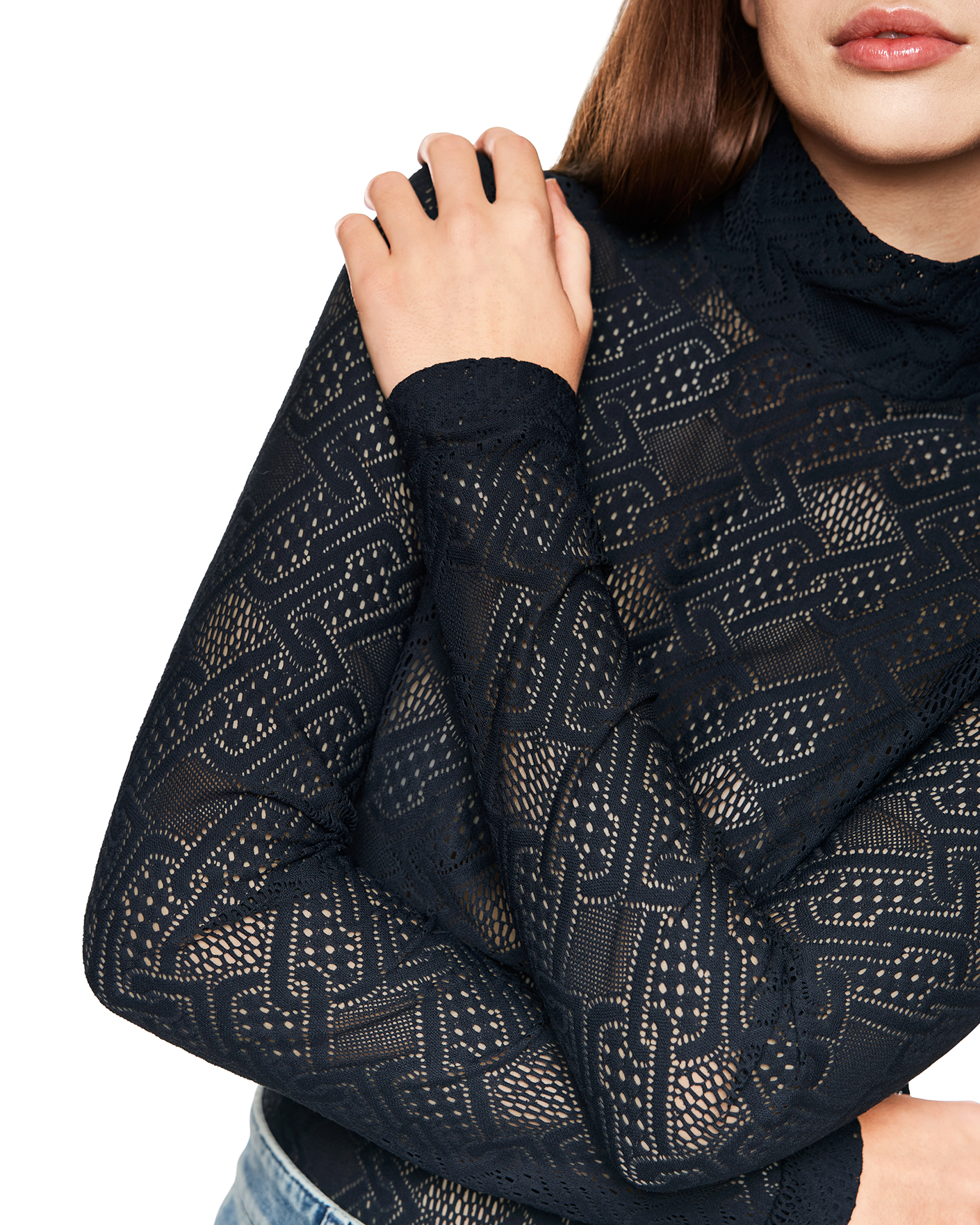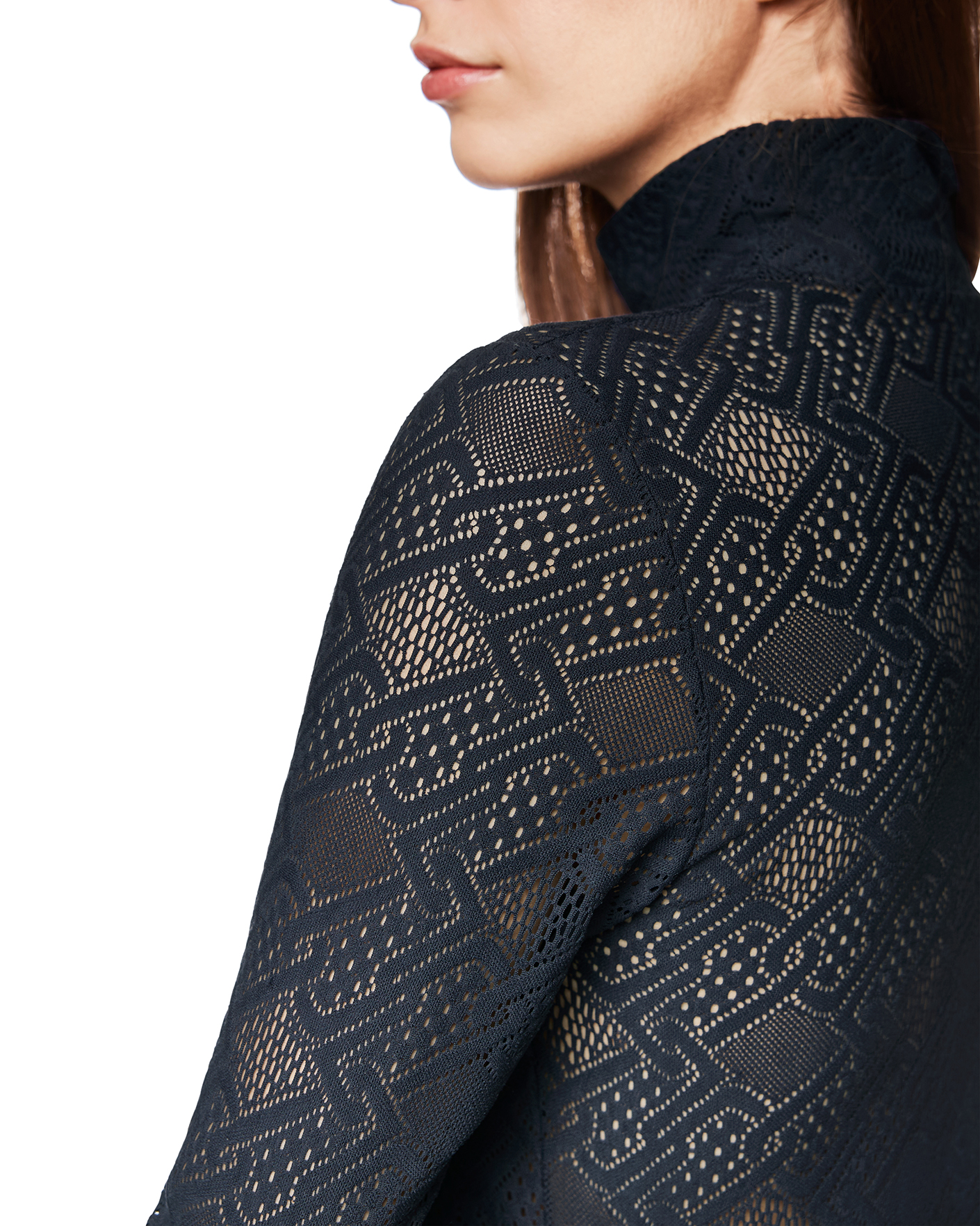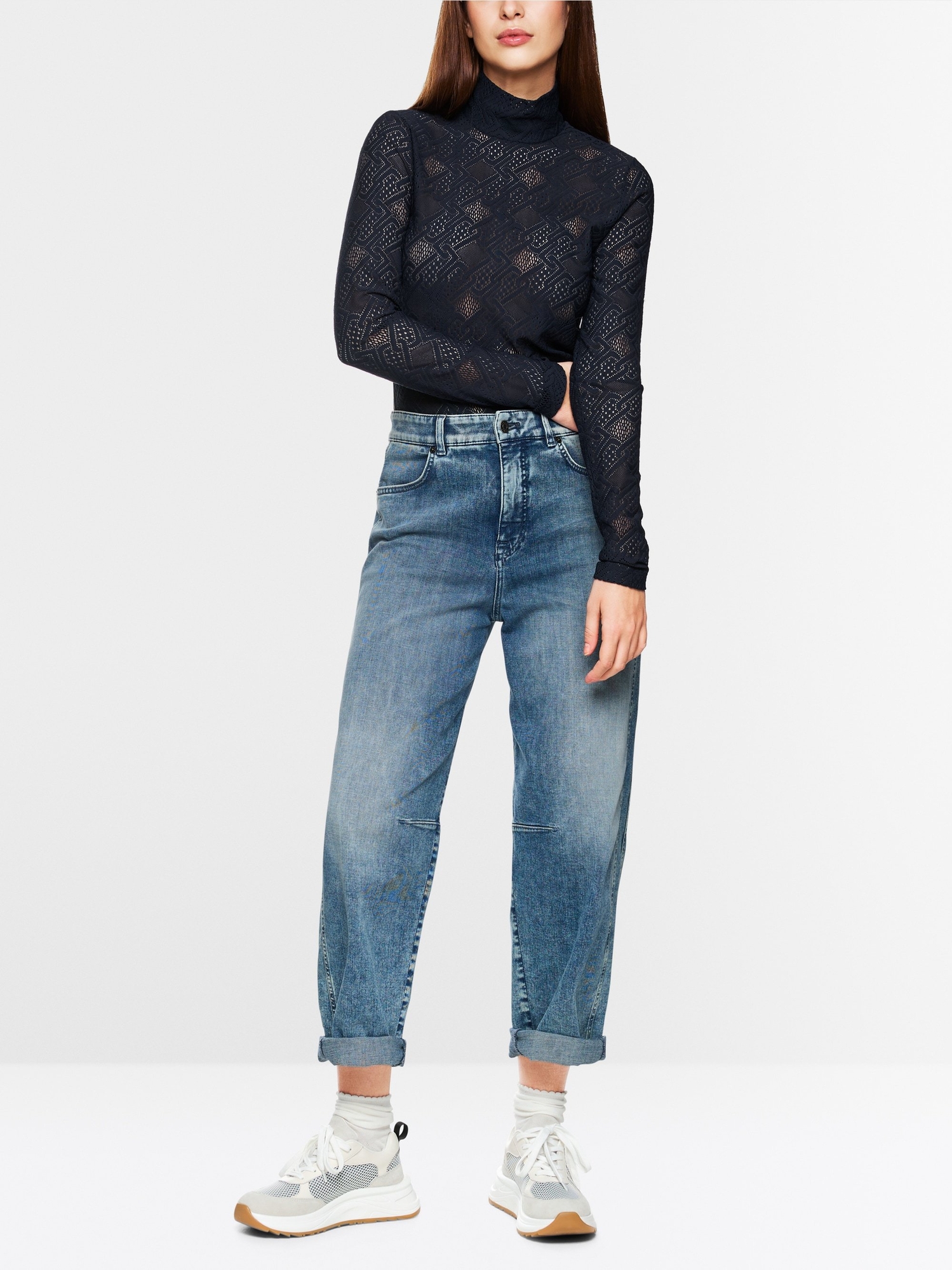 Приталенная водолазка Marc Cain Sport темно-синего цвета в текстурный рисунок. Модель с воротником-стойка и длинными рукавами. Водолазка - универсальная вещь на каждый день.