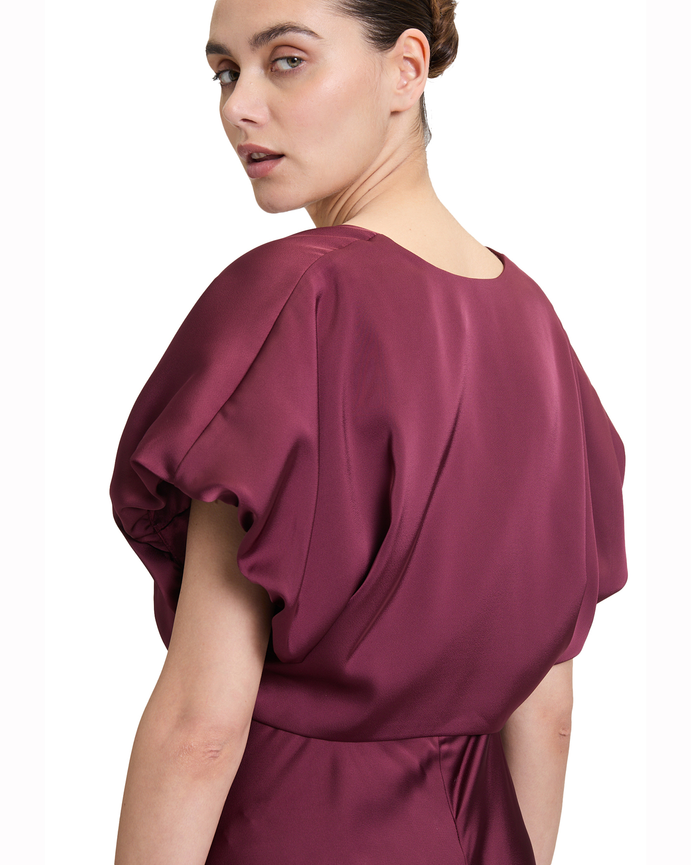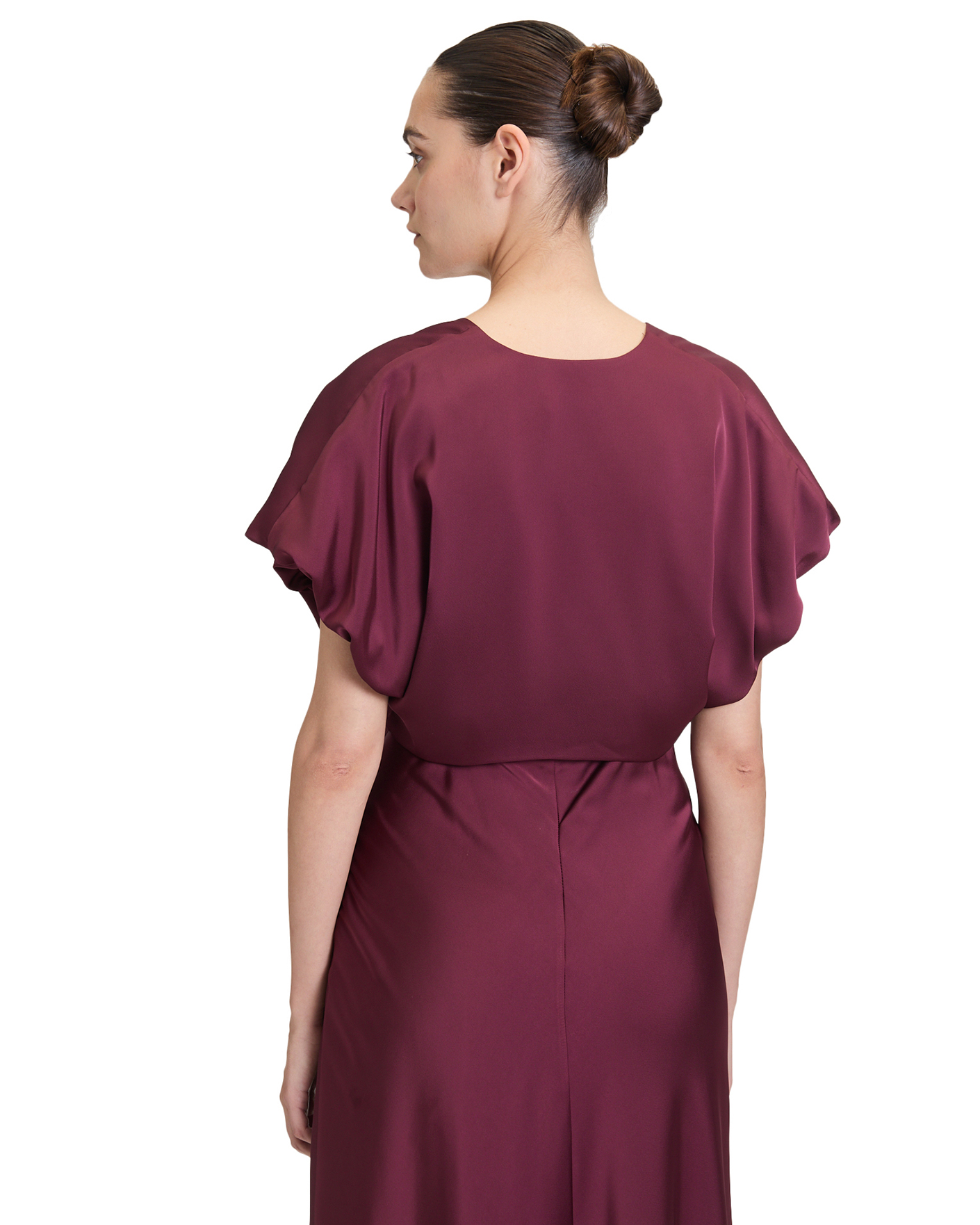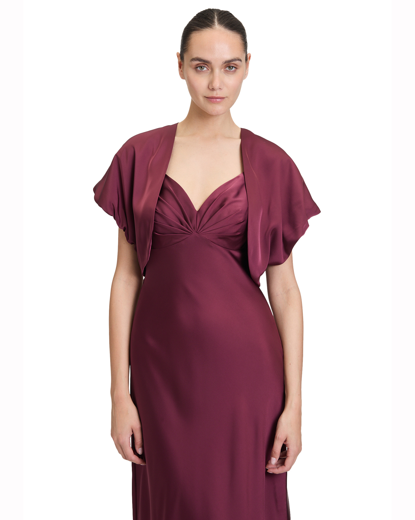 Укороченное болеро Vera Mont вишневого цвета с атласным блеском. Модель с круглым воротом и закругленным краем без застежки. Короткие рукава со сборкой, придающей объем. Болеро можно сочетать с платьем, топом и юбкой.
