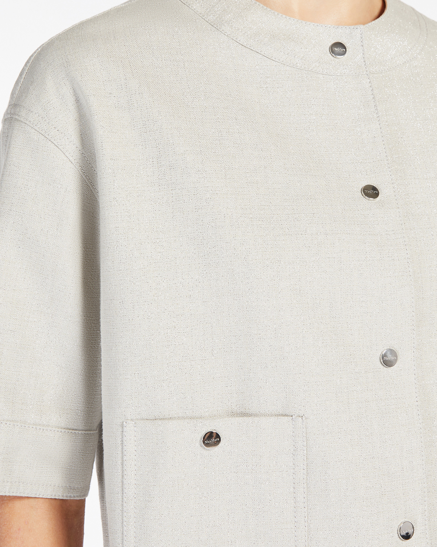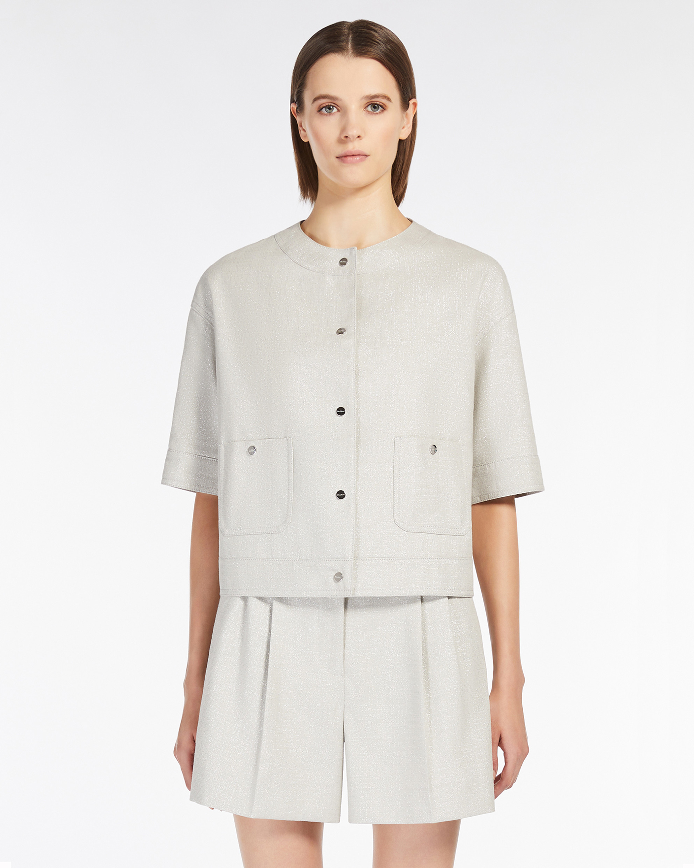 Свободный жакет Max Mara Studio серо-бежевого цвета в строчный рисунок с люрексом. Модель с круглым вырезом, застежка на кнопки, короткие рукава, накладные карманы по бокам. Жакет можно сочетать с топом, майкой, рубашкой, юбкой, шортами и брюками.