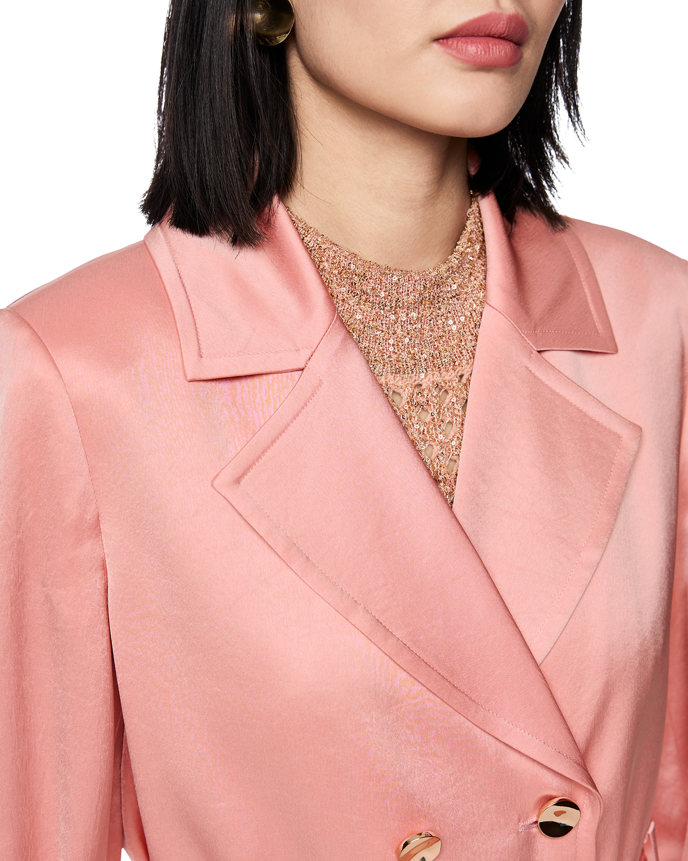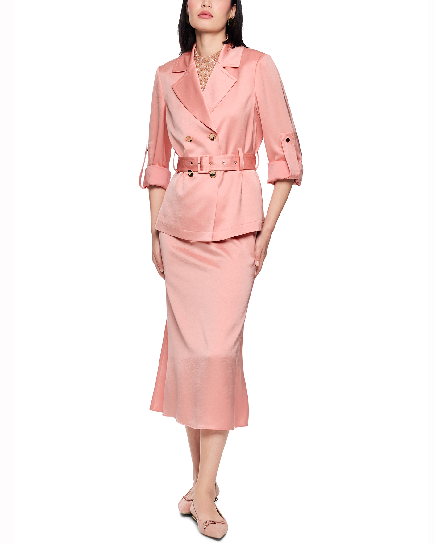 Двубортный жакет Marc Cain Collection бежево-розового цвета с атласным блеском. Приталенная модель с лацканами, застежка на контрастные пуговицы, рукава 3/4 со шлейкой, также имеется вставной пояс с пряжкой в тон. Жакет станет элегантным дополнением к вашему гардеробу.