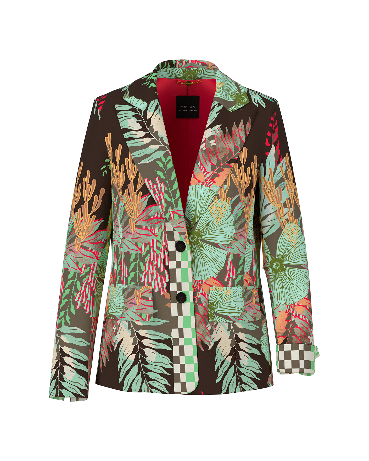 Яркий жакет Marc Cain Collection коричнево-салатового цвета в цветочный рисунок. Модель с лацканами, застежка на пуговицы, врезные карманы с клапанами по бокам. Стильный жакет станет ярким акцентом вашего образа.