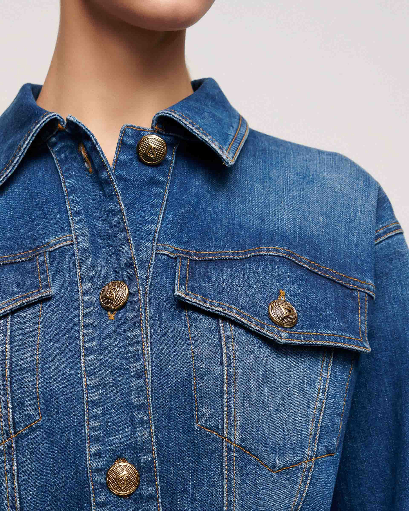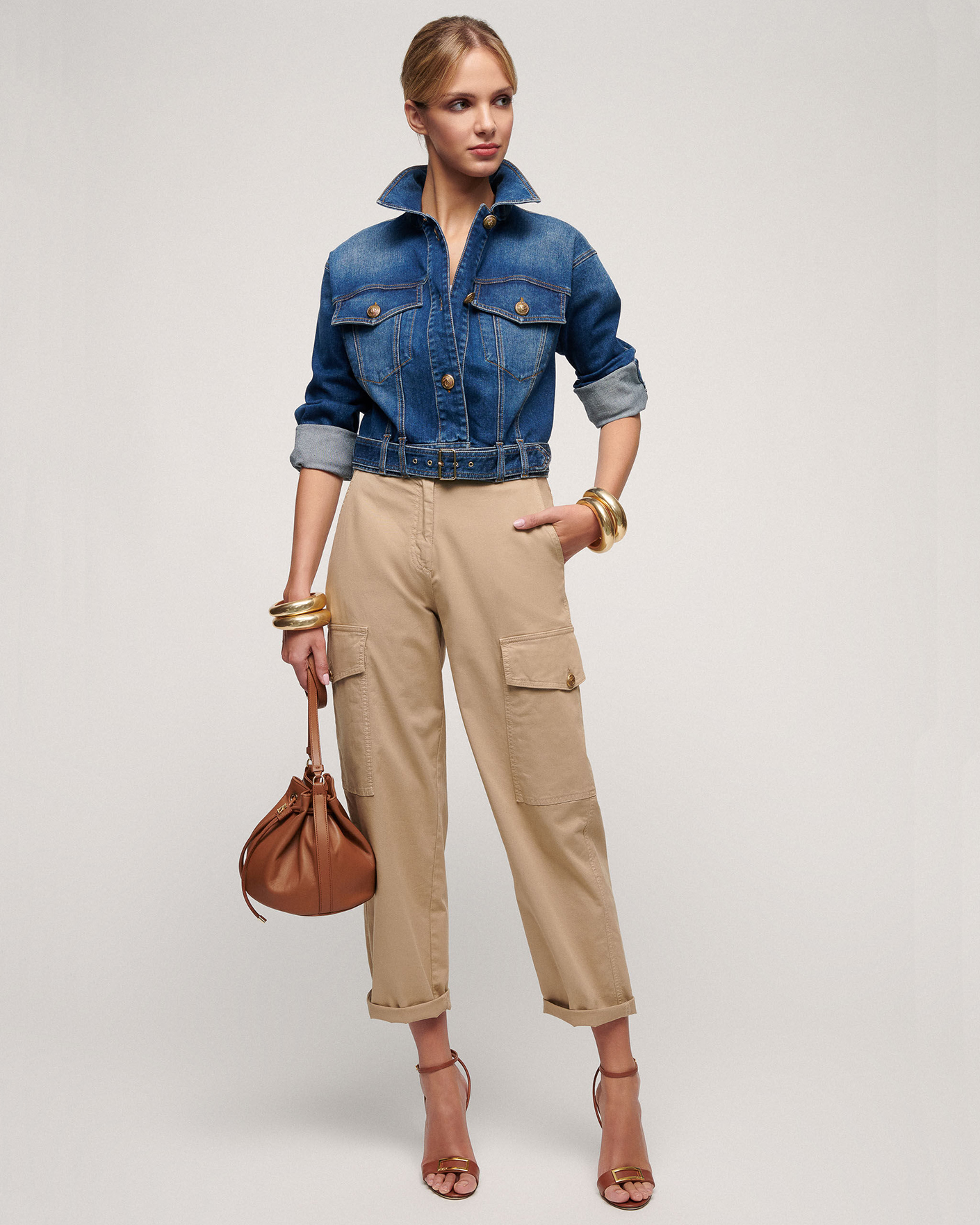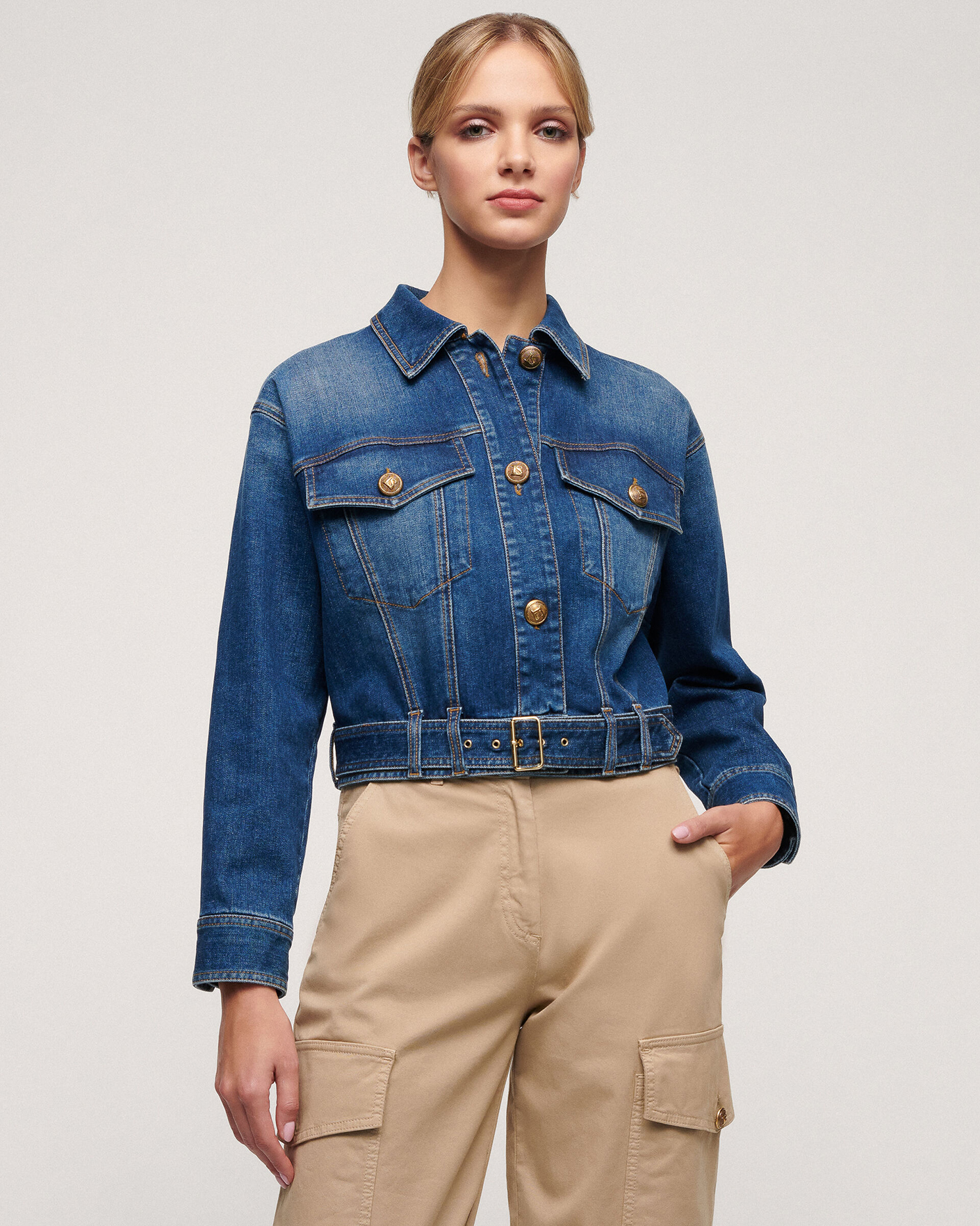 Джинсовый жакет-куртка Luisa Spagnoli синего цвета с небольшим отбеленным эффектом. Укороченная хлопковая модель с отложным воротником и застежкой на крупные пуговицы. Имеются нагрудные карманы с клапанами, а также вставной пояс с пряжкой в тон. Стильный джинсовый жакет-куртка станет незаменимой вещью на каждый день.