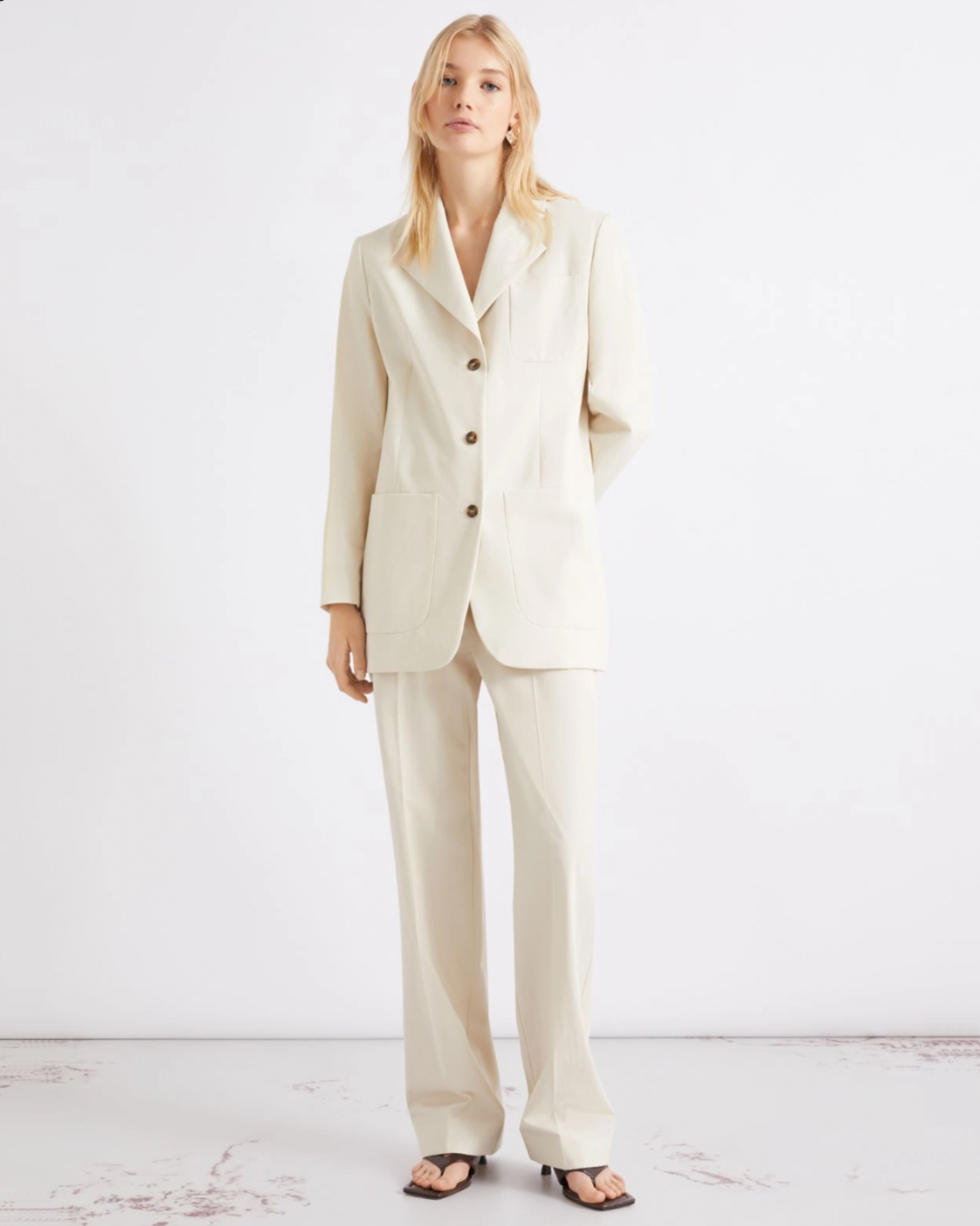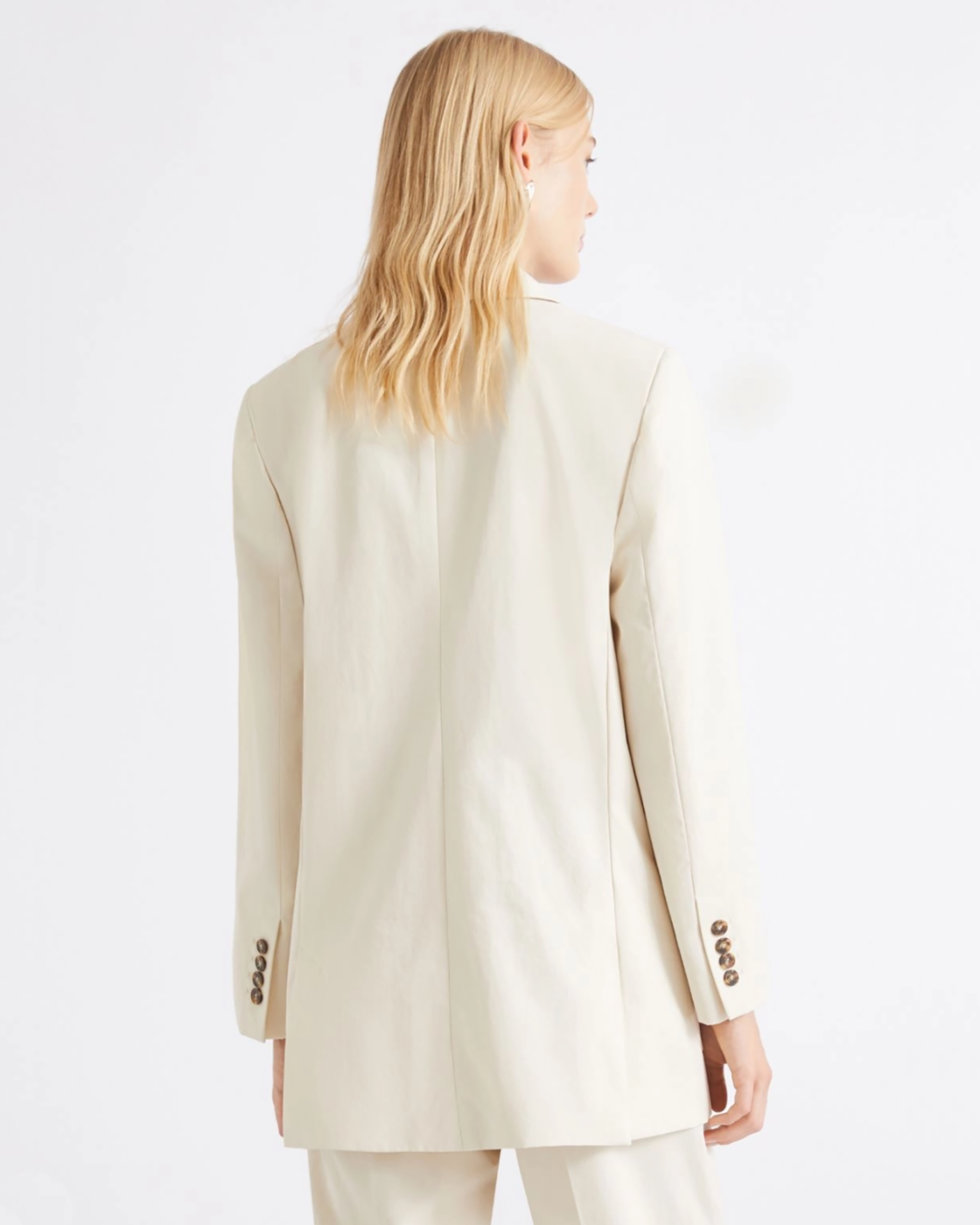 Удлиненный жакет Marella молочного цвета. Модель из 100% хлопка, с лацканами, застежка на контрастные пуговицы, имеются накладные карманы по бокам. Жакет отлично впишется в ваш гардероб.