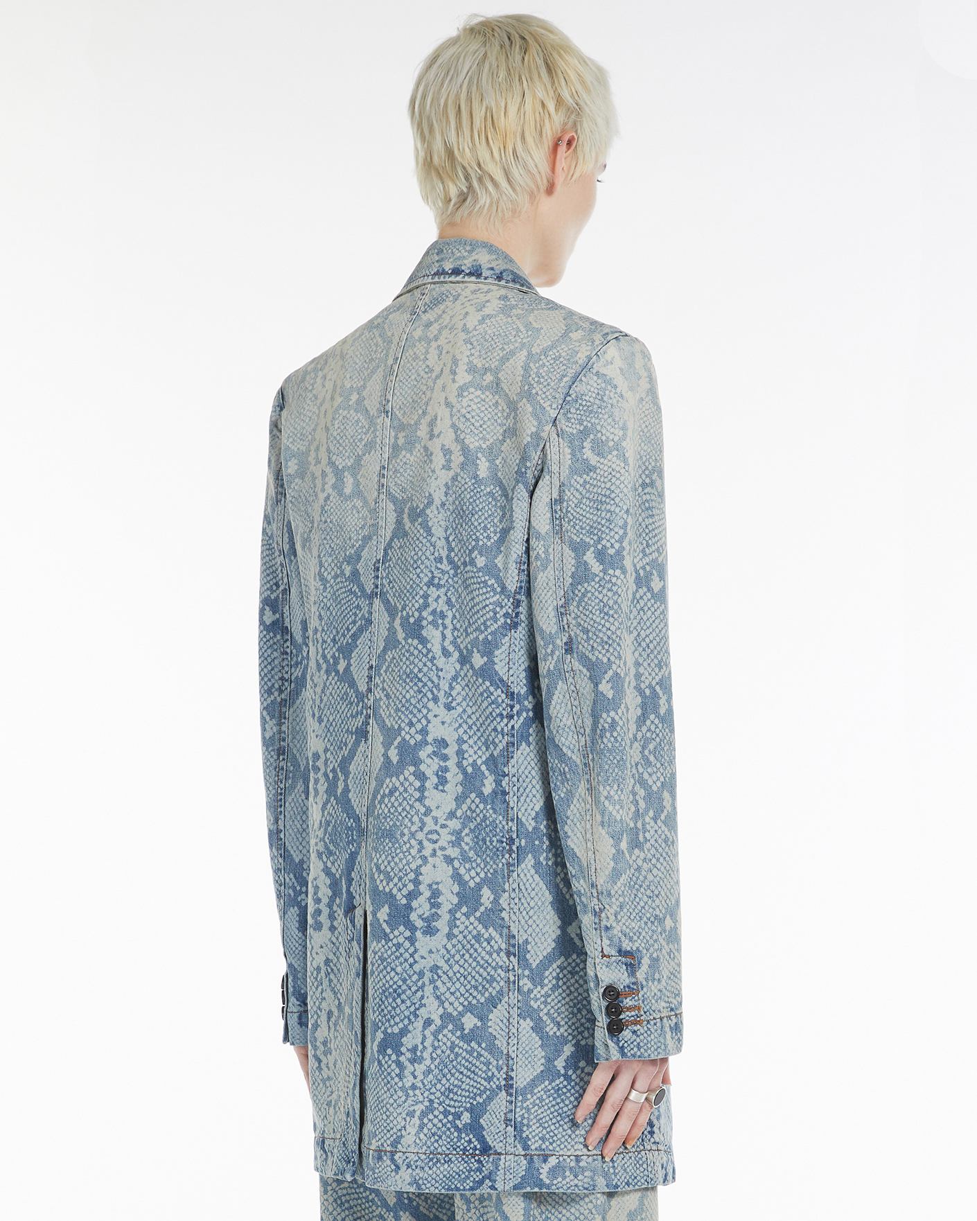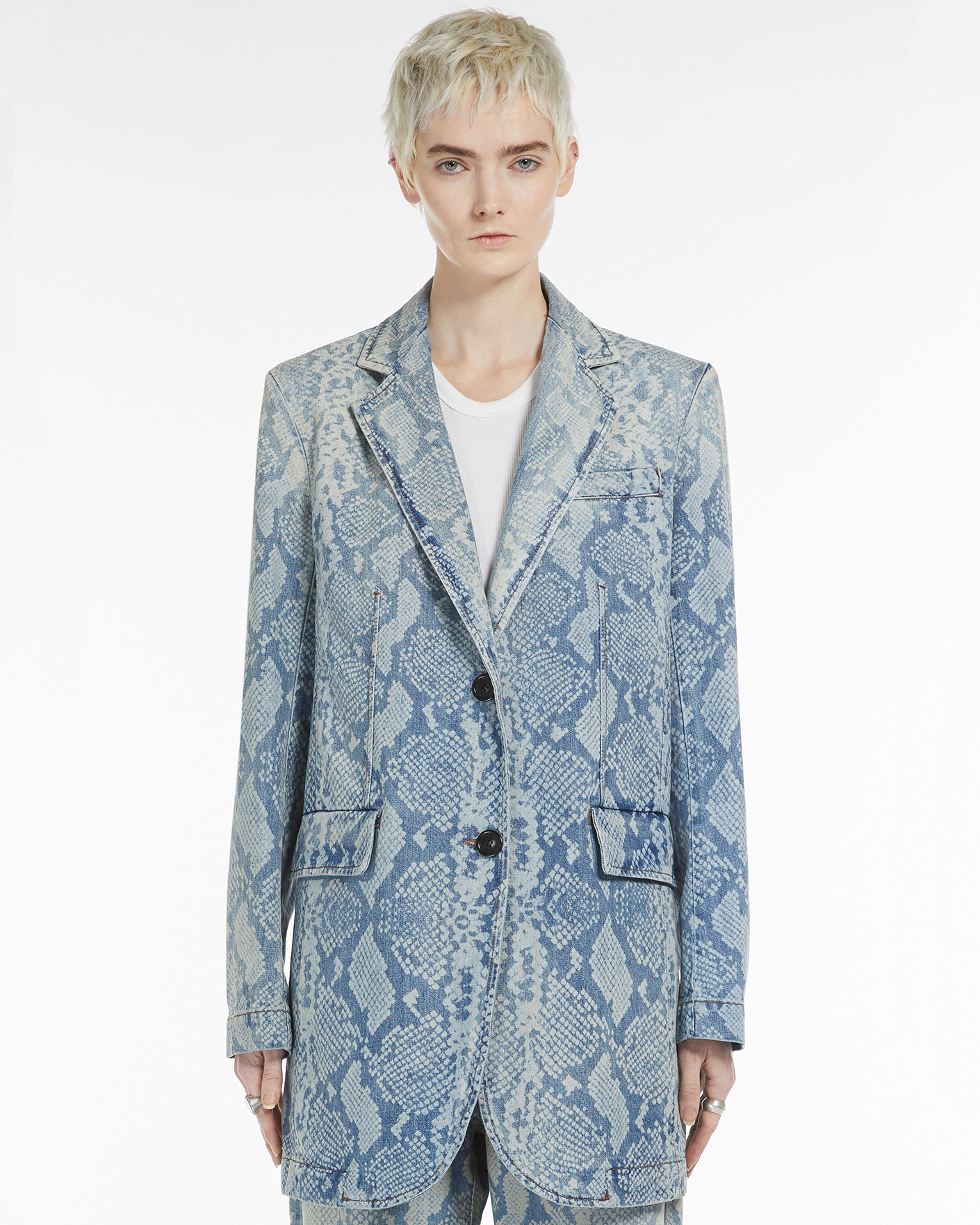Стильный жакет Sportmax серо-голубого цвета в змеиный принт. Модель из 100% хлопка с лацканами, застежка на черные пуговицы, врезные карманы с клапанами по бокам. Жакетстанет фаворитом вашего гардероба.