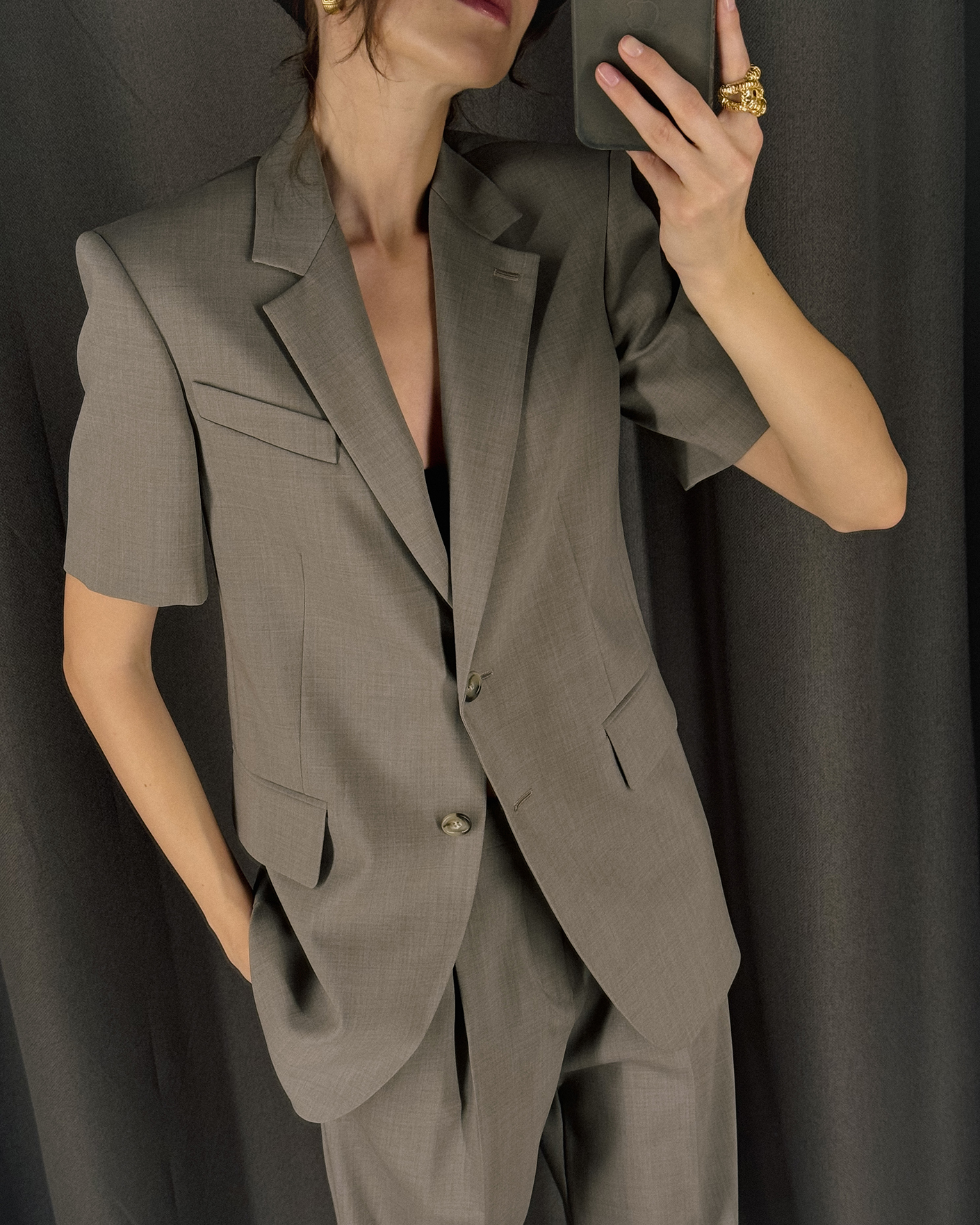 Приталенный жакет Sportmax серо-коричневого цвета в строчный рисунок. Модель из 100% шерсти с короткими рукавами, с лацканами, застежка на пуговицы, закругленные края, врезные карманы с клапанами по бокам. Жакет отлично впишется в ваш деловой гардероб.