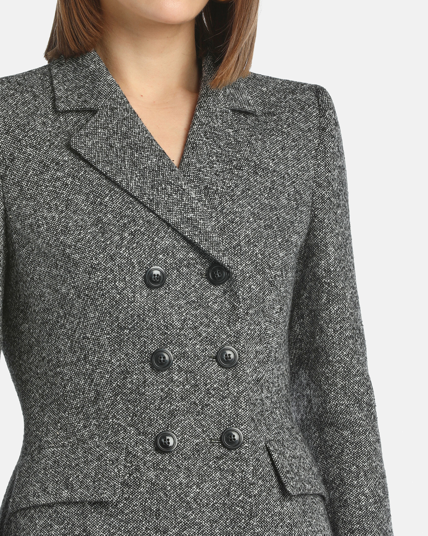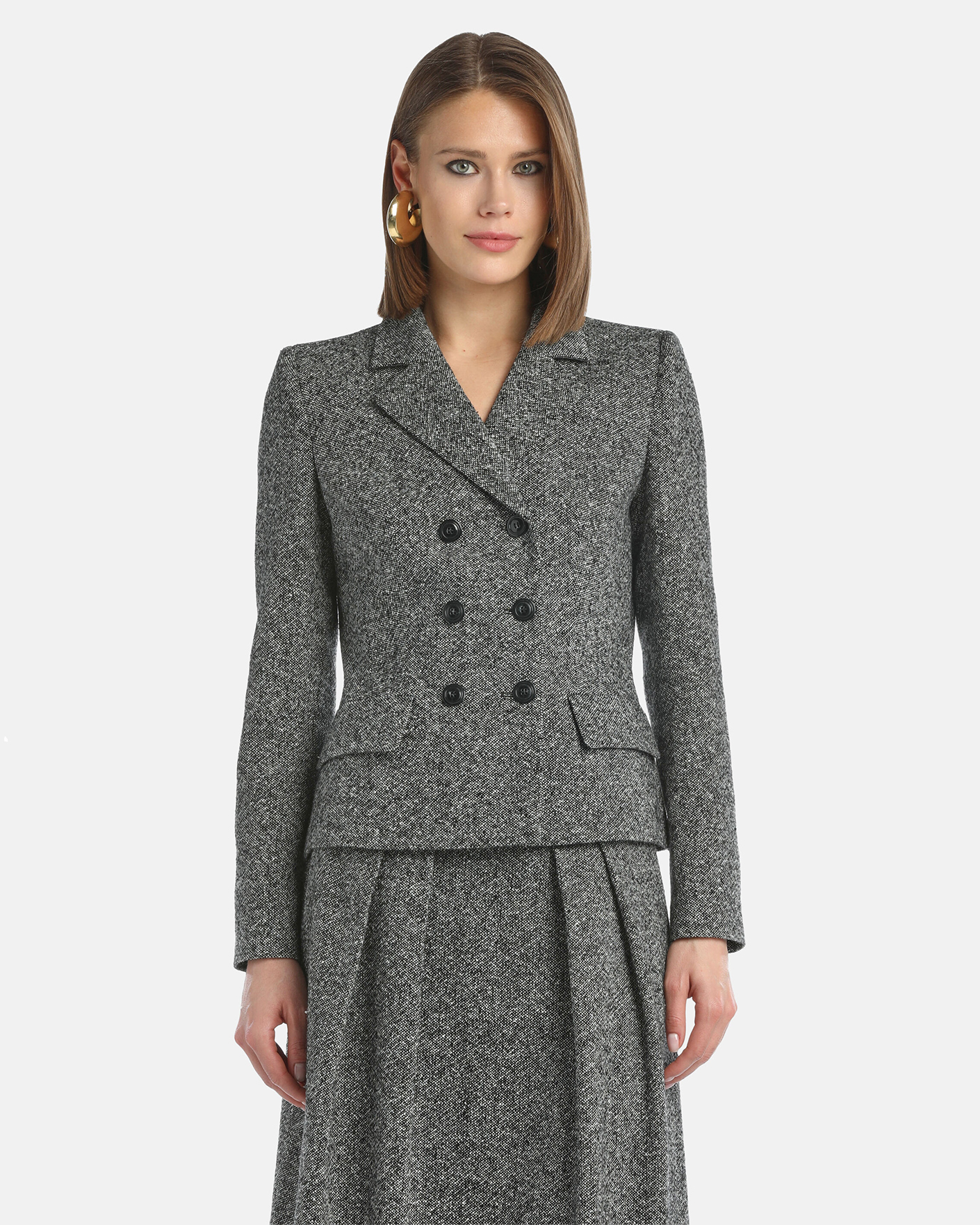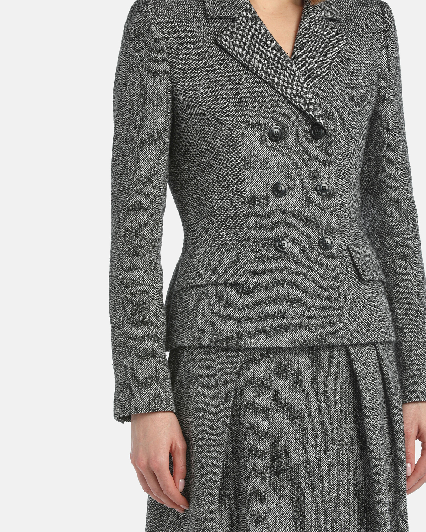 Приталенный двубортный жакет Luisa Spagnoli серо-черного цвета в мелкий строчный рисунок. Модель с лацканами, застежка на шесть пуговиц, обманные карманы с клапанами по бокам. Жакет отлично впишется в ваш гардероб в офисном стиле.