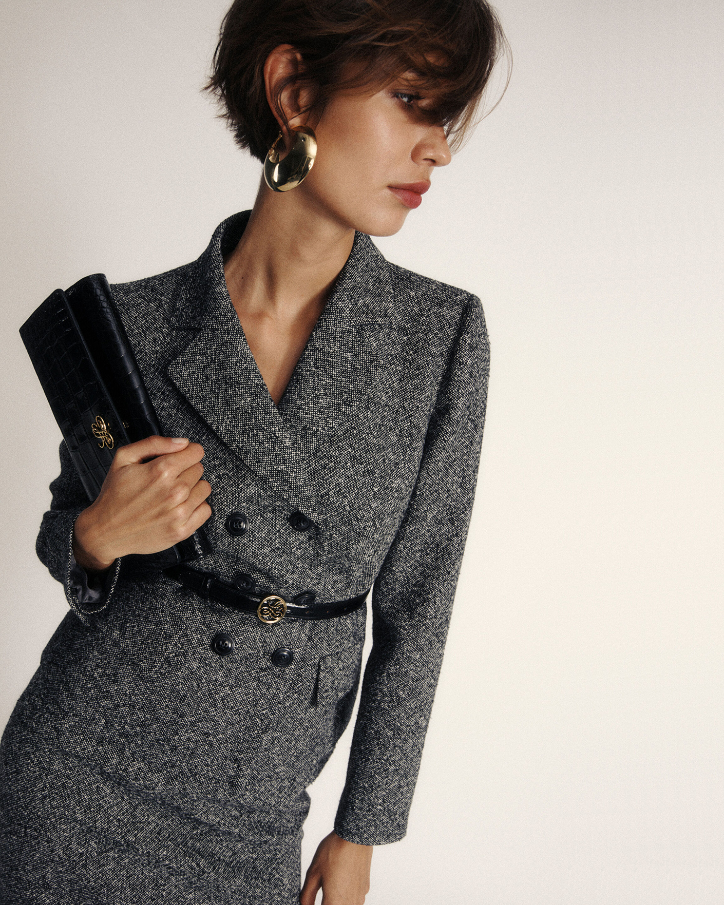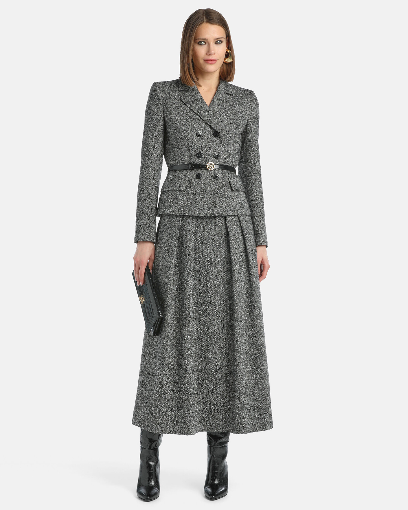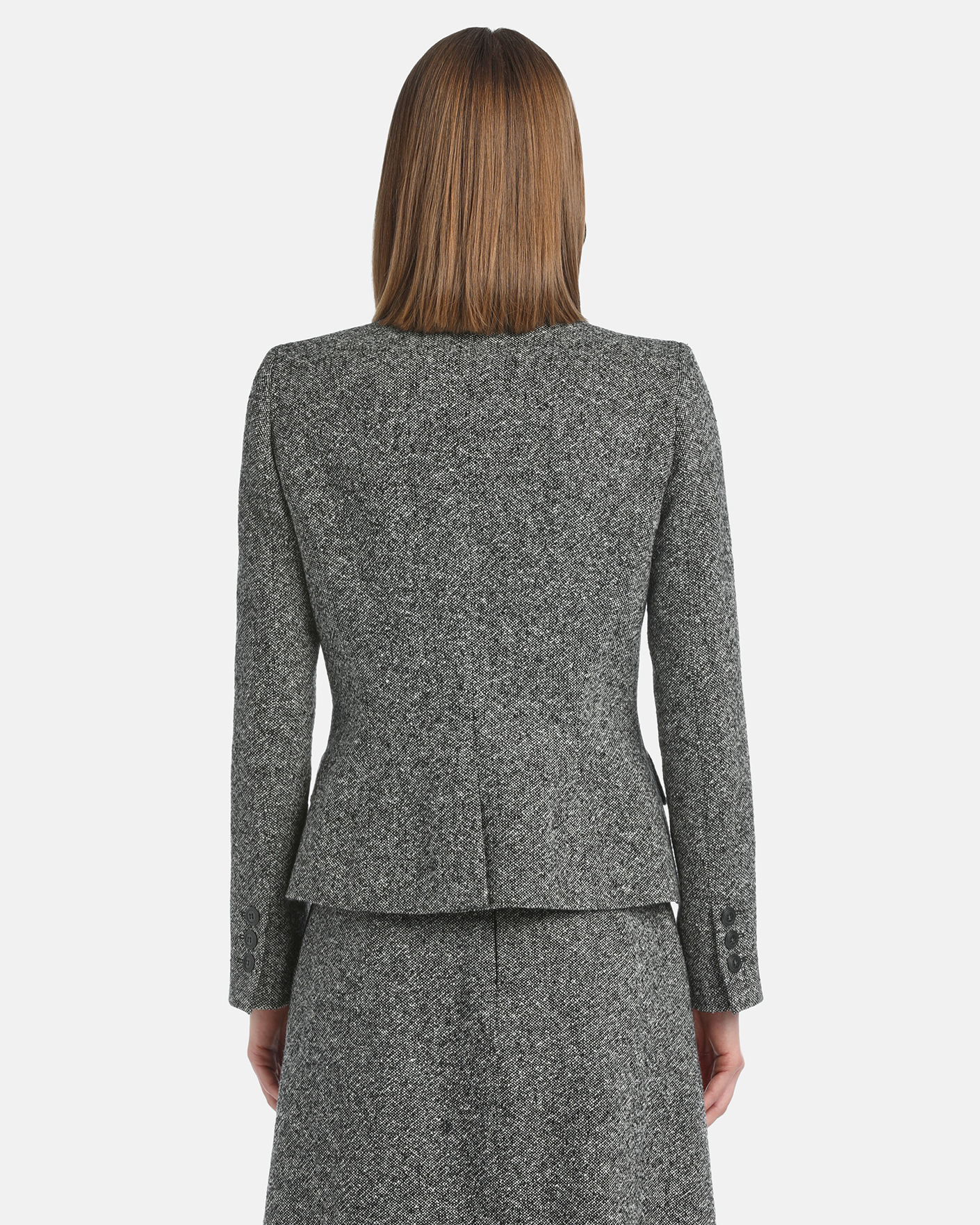 Приталенный двубортный жакет Luisa Spagnoli серо-черного цвета в мелкий строчный рисунок. Модель с лацканами, застежка на шесть пуговиц, обманные карманы с клапанами по бокам. Жакет отлично впишется в ваш гардероб в офисном стиле.