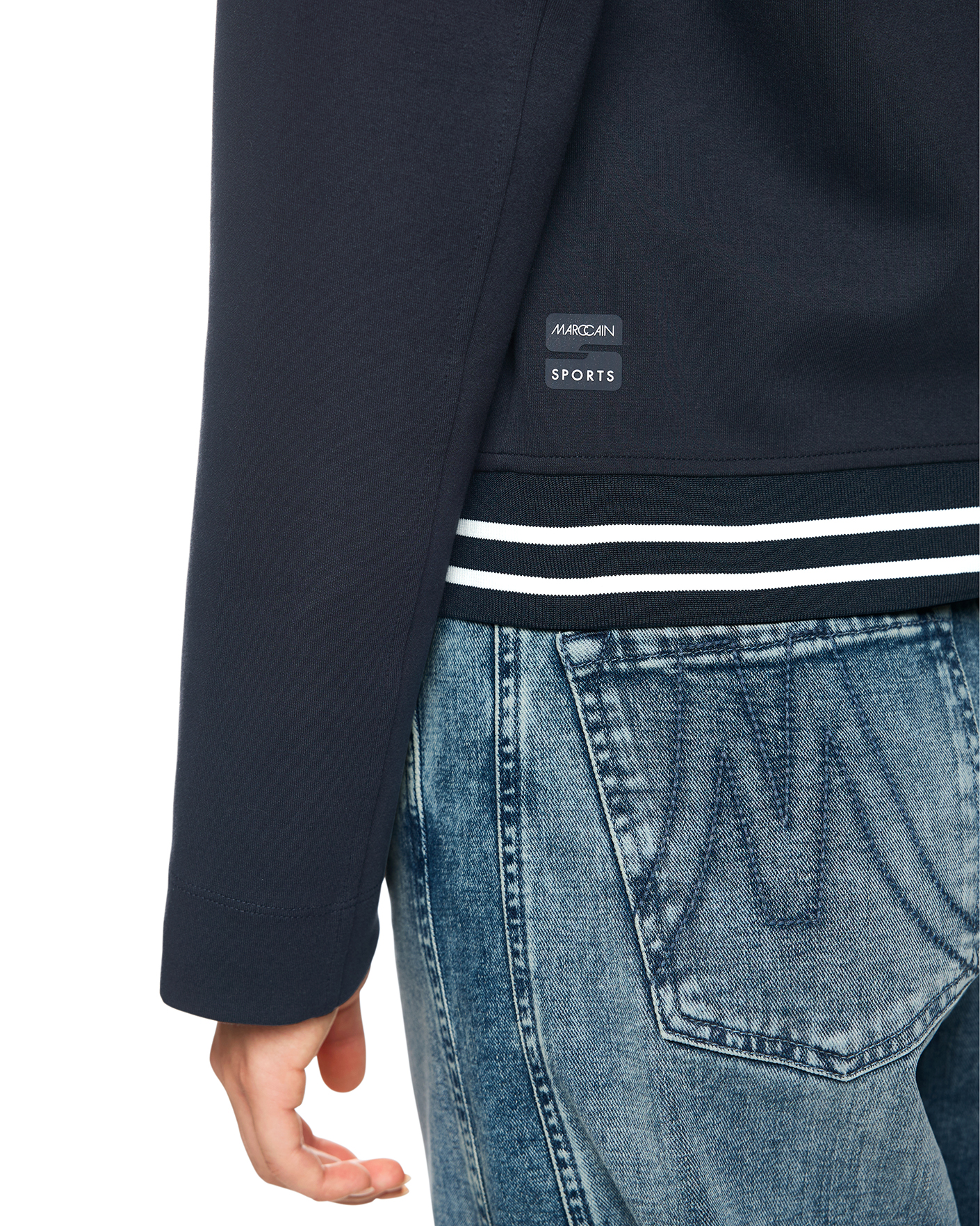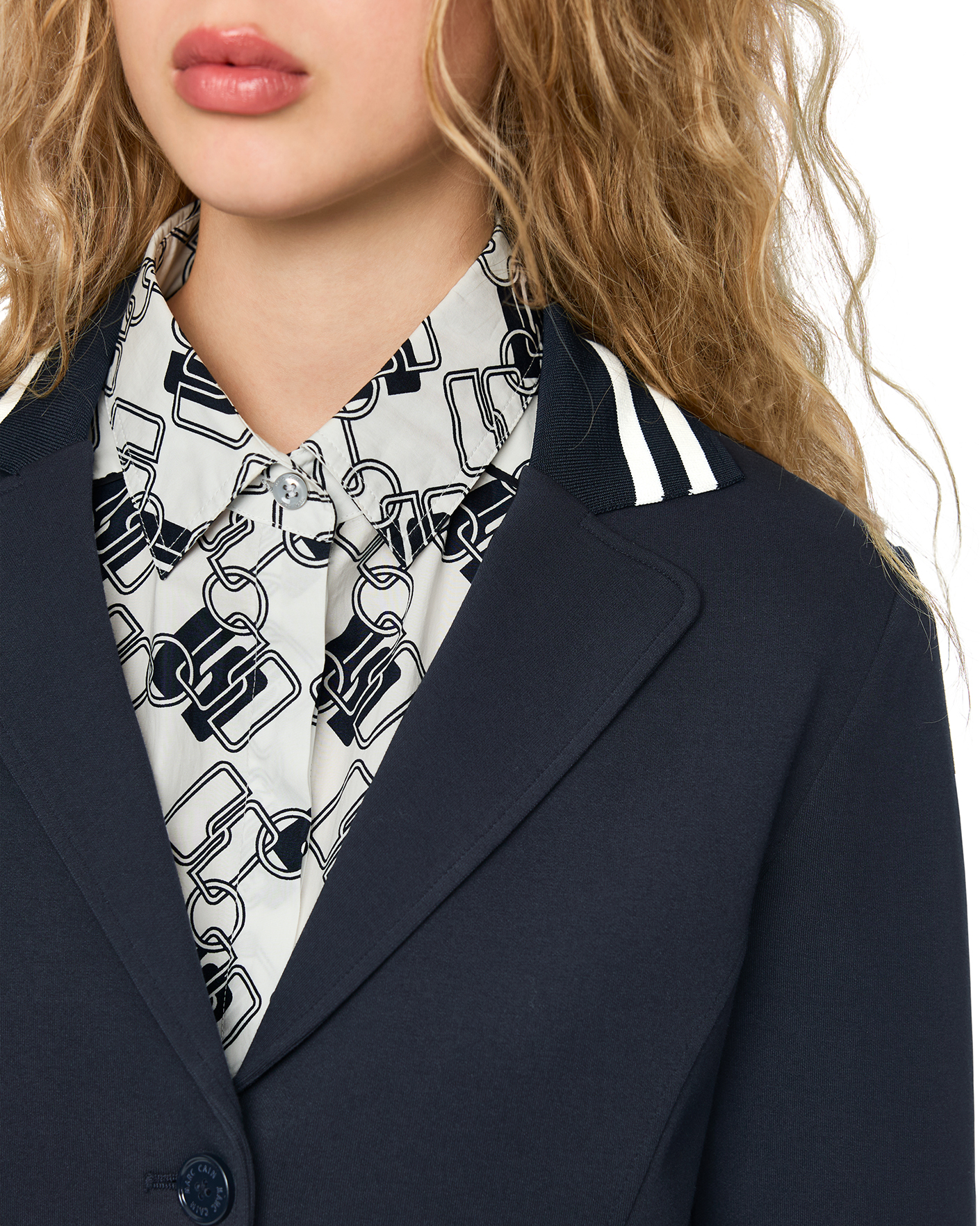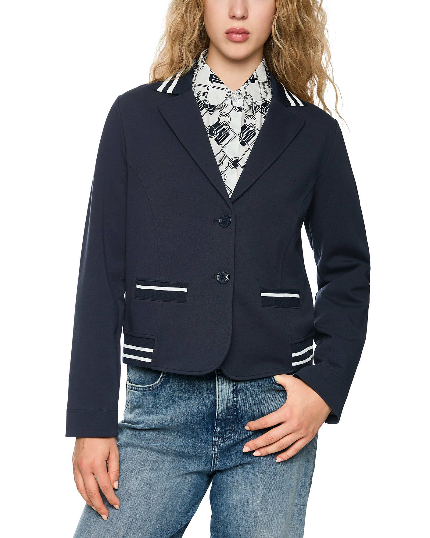 Полуприталенный жакет Marc Cain Sport темно-синего цвета. Хлопковая модель с лацканами, застежка на пуговицы в тон, обманные карманы по бокам. Также по краю ворота и низа контрастные полосы на резинке. Жакет отлично впишется в ваш гардероб.