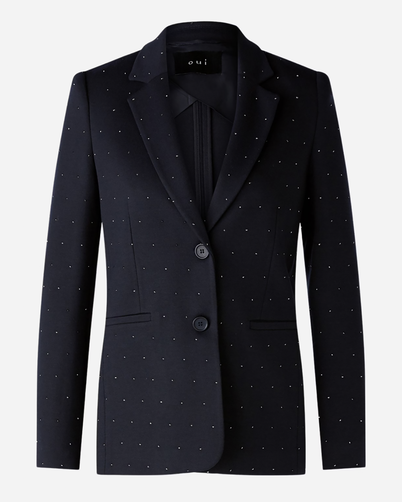 Жакет OUI темно-синего цвета в мелкий принт-горох. Модель с лацканами, застежка на две пуговицы в тон, имеются врезные карманы по бокам. Жакет - универсальная вещь на каждый день.