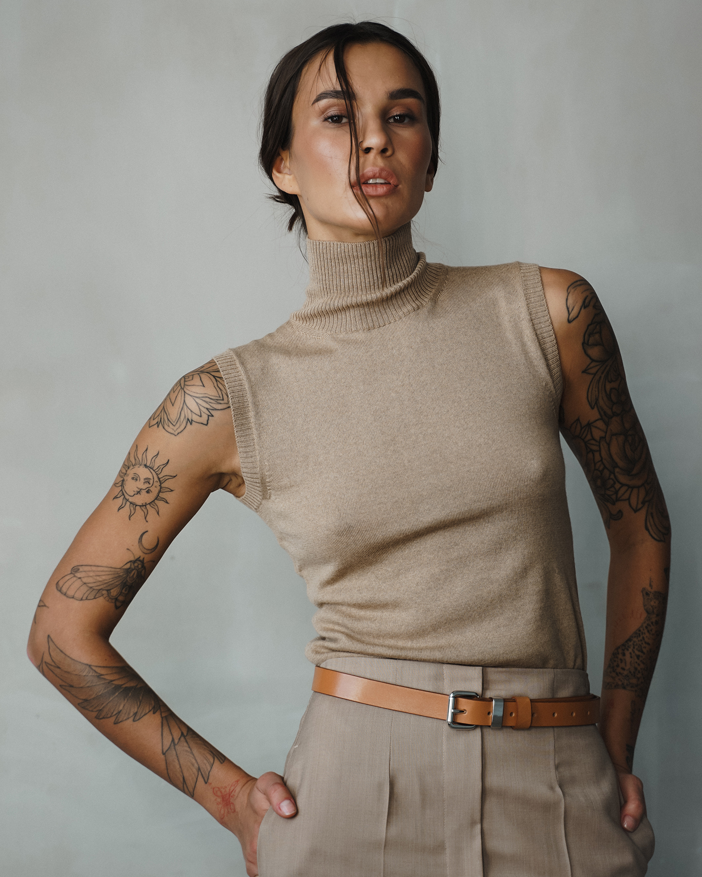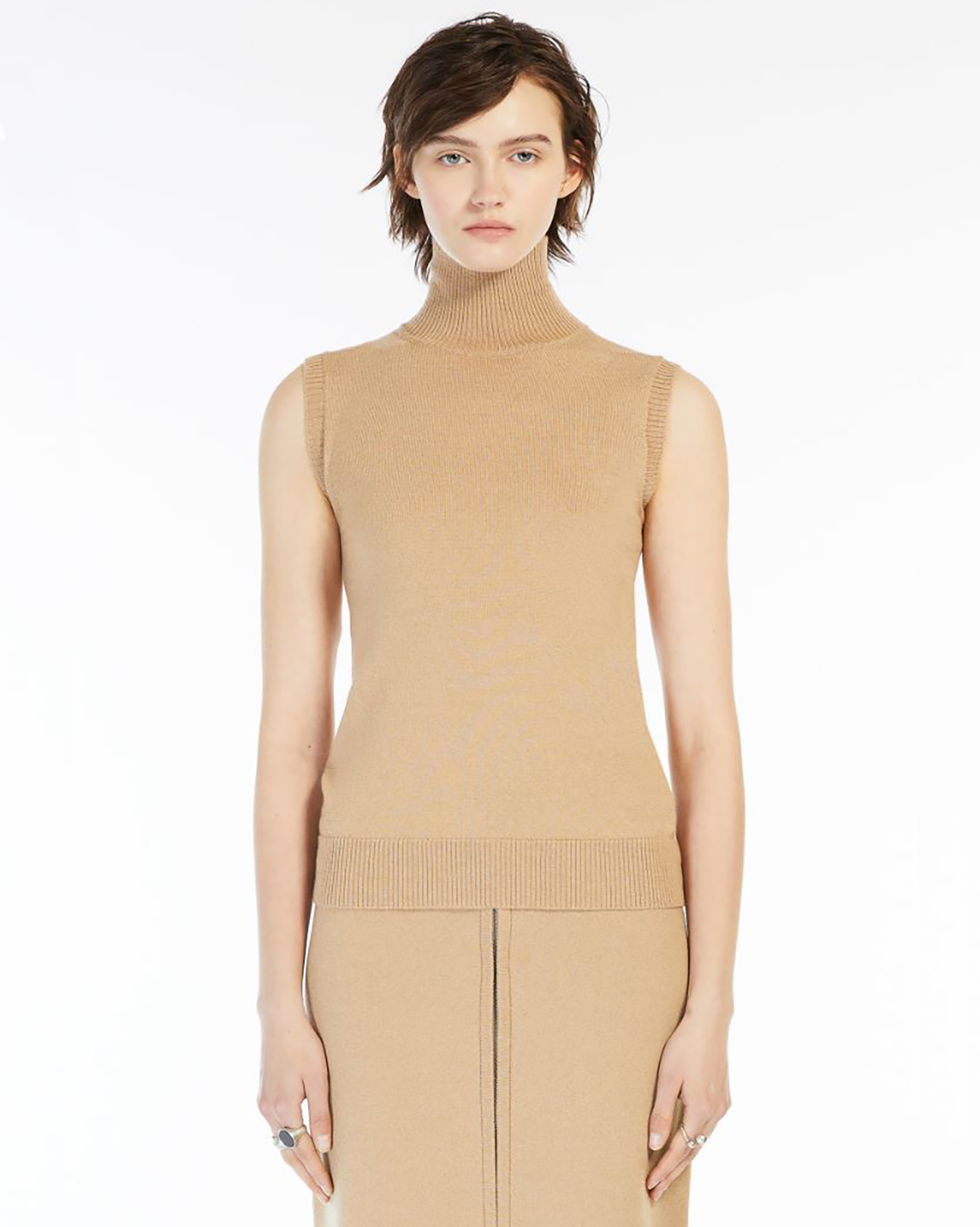 Жилет Sportmax бежевого цвета выполнен из 100% шерсти. Модель с воротником-стойка и низом на тонкой ребристой резинке. Жилет можно сочетать с кардиганом, жакетом, жилетом, юбкой и брюками.