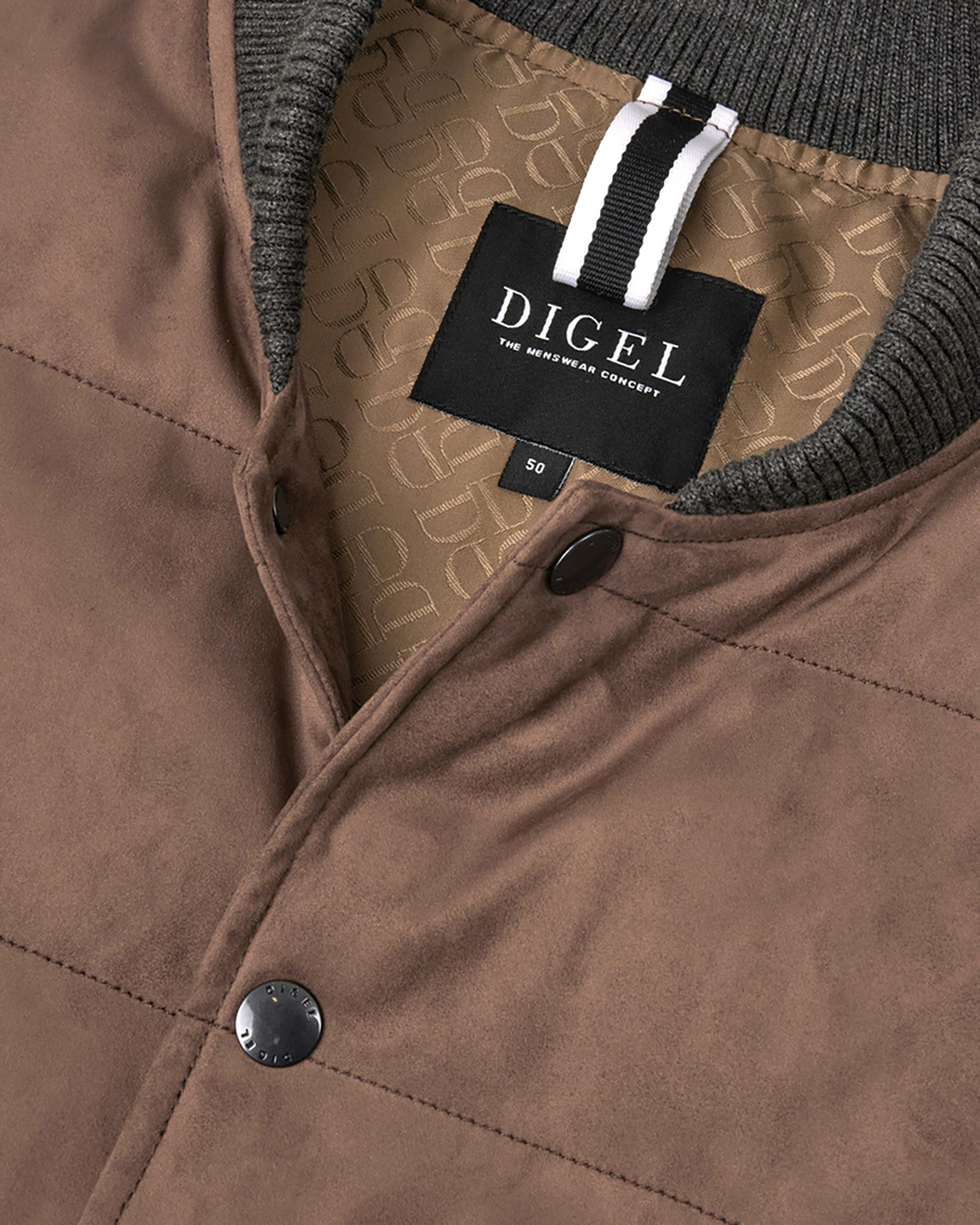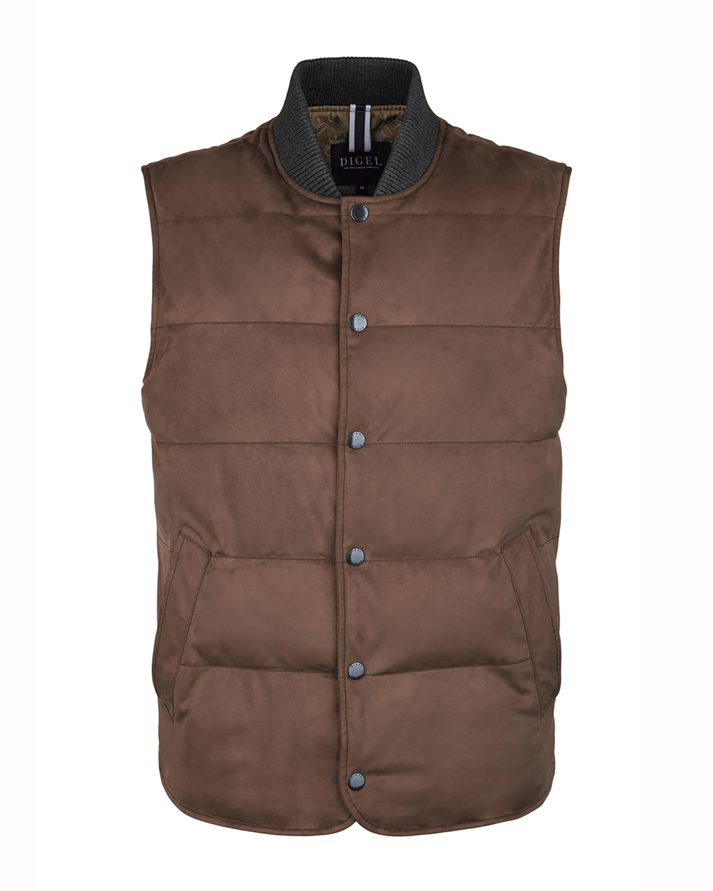 Утепленный жилет Digel коричневого цвета в горизонтальную стежку. Модель с небольшим воротником-стойка, вывязанный резинкой, застежка на кнопки, врезные карманы по бокам. Жилет - универсальная вещь на прогулку.