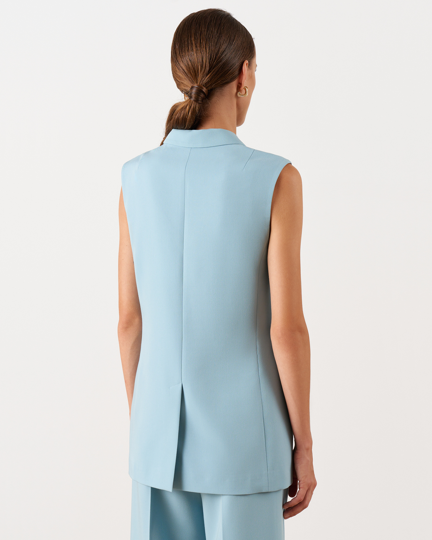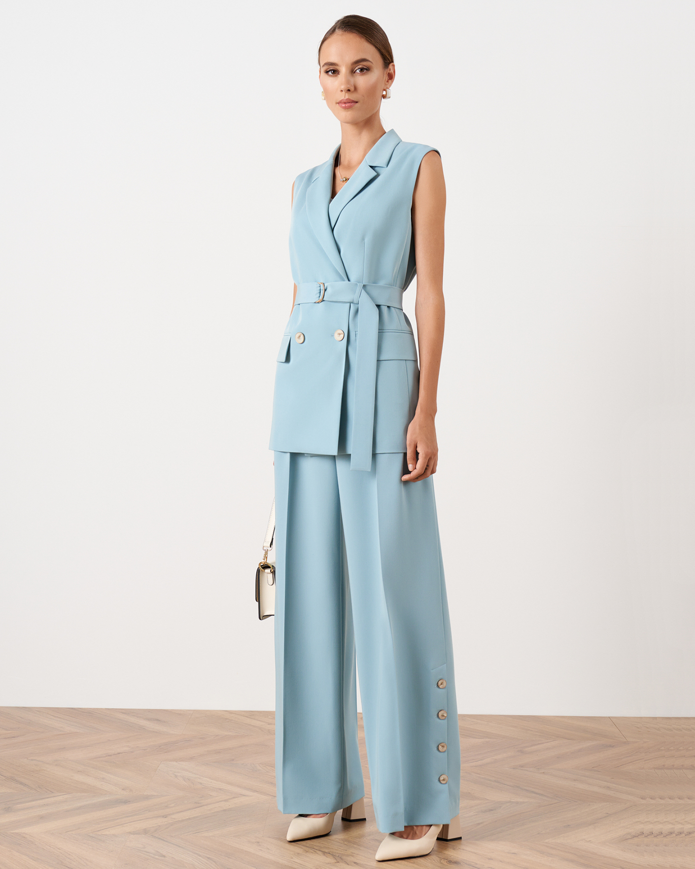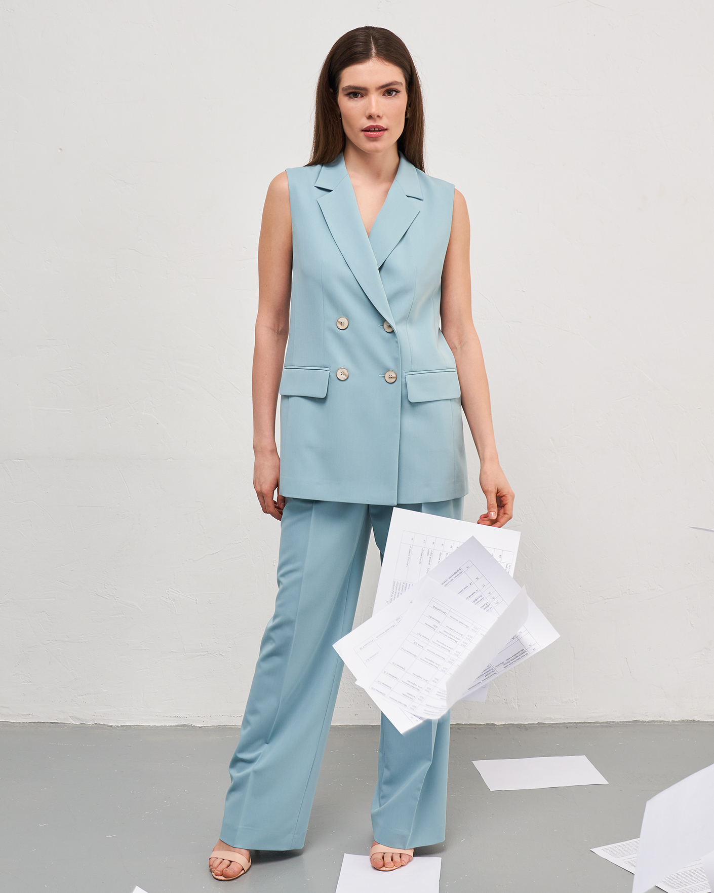 Двубортный классический жилет Nelva мятно-голубого цвета. Модель с лацканами, застежка на контрастные пуговицы, имеются врезные карманы с клапанами по бокам. Стильный жилет можно носить как самостоятельное изделие, так и комбинировать с рубашкой, блузой, джемпером, водолазкой.