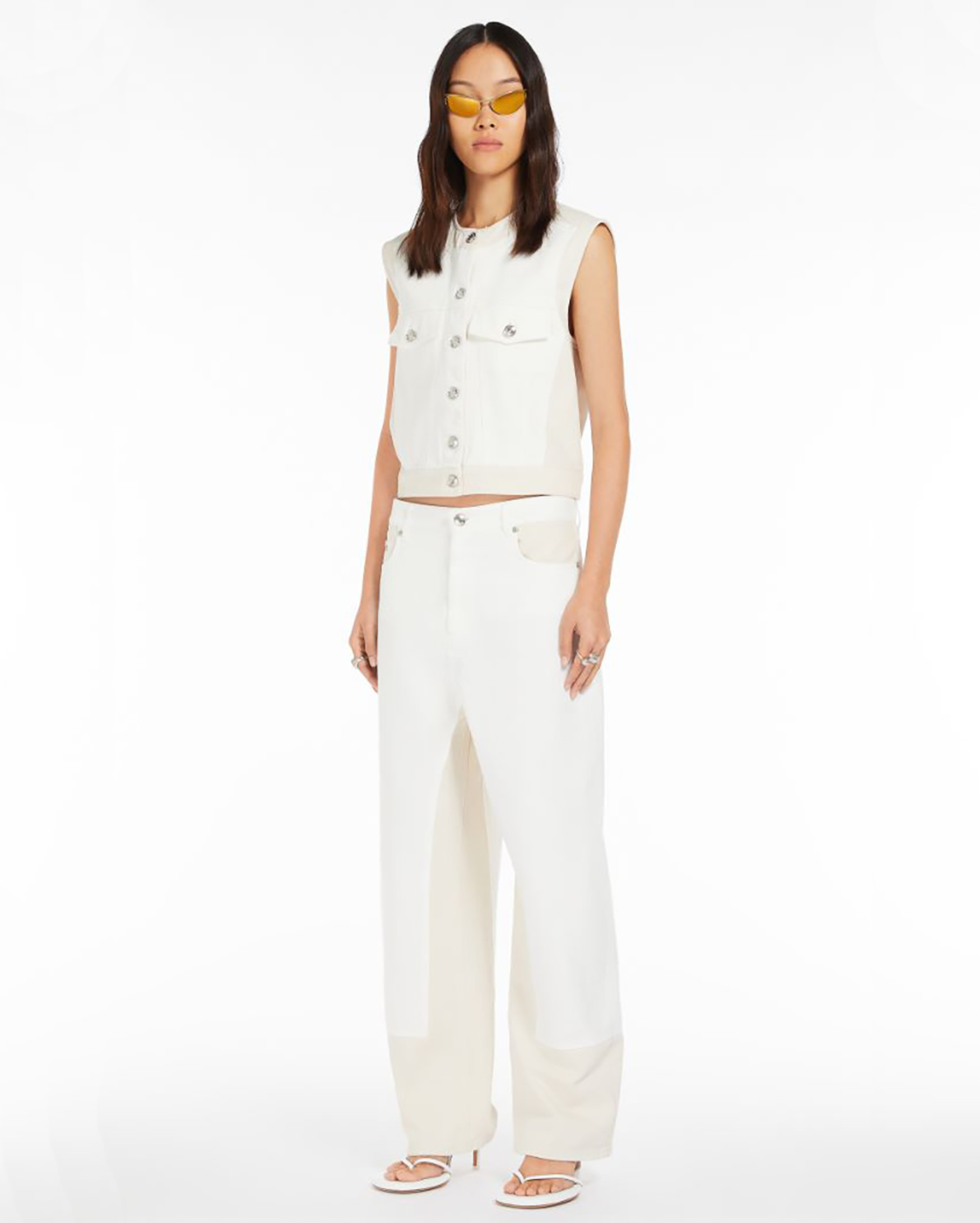 Джинсовый жилет Sportmax бело-бежевого цвета. Модель из 100% хлопка, круглый вырез, застежка на металлические пуговицы, имеются обманные клапаны на груди. Жилет - фаворит вашего гардероба.
