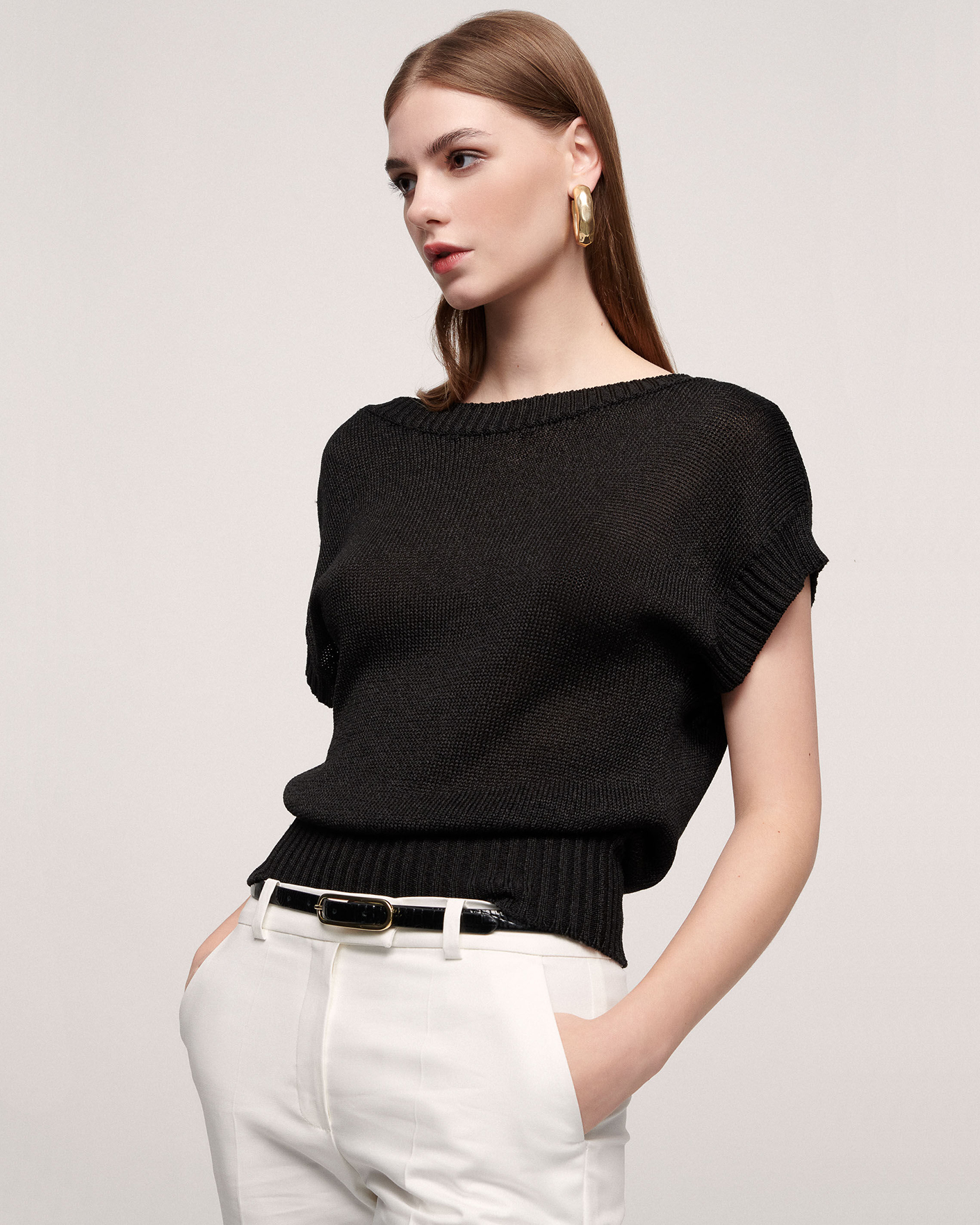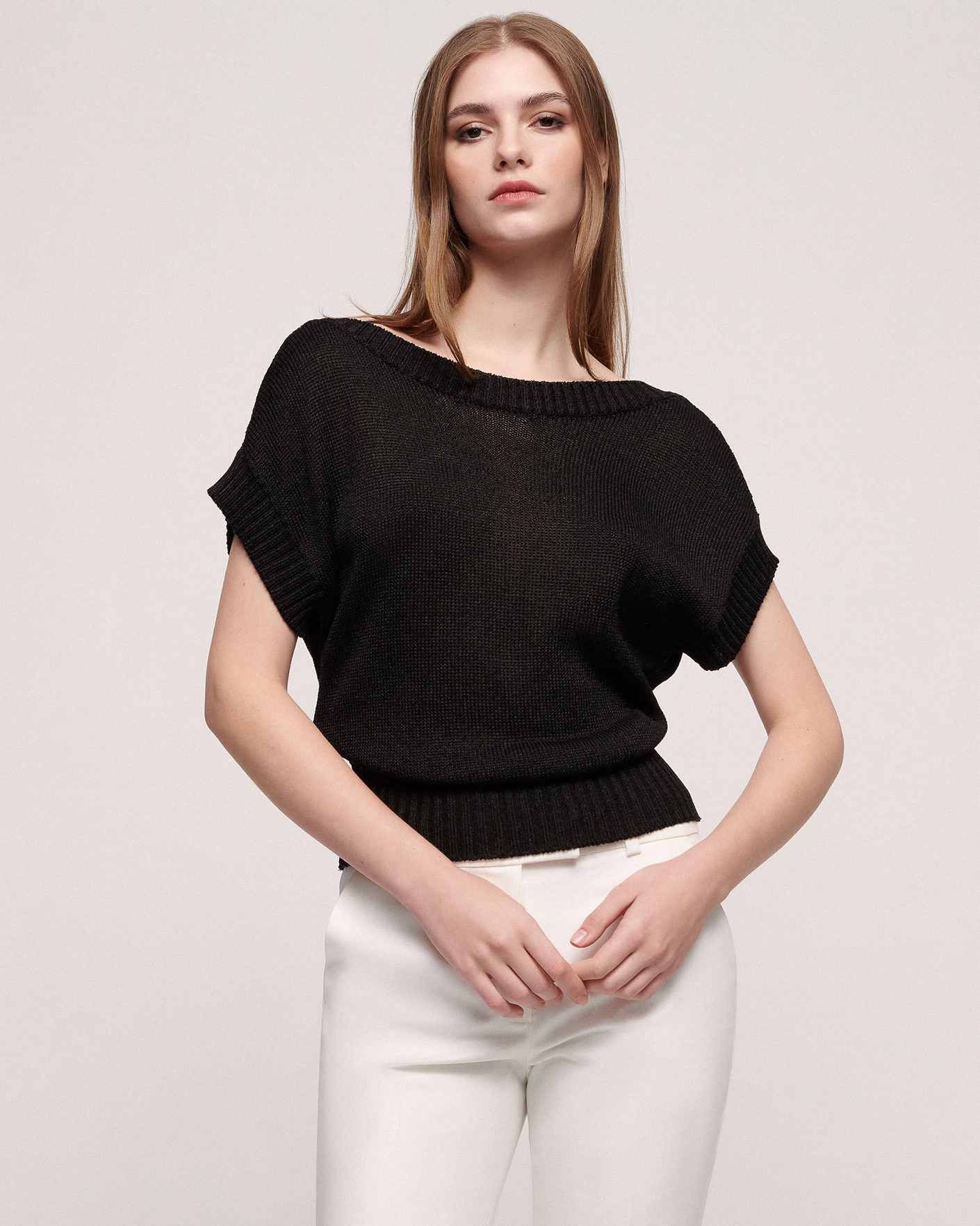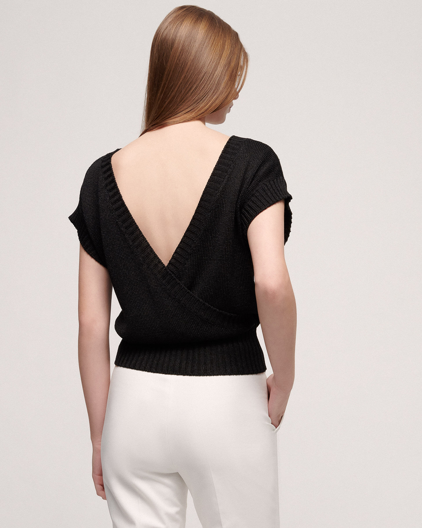 Полуприталенный жилет Luisa Spagnoli черного цвета в вертикальный строчный рисунок. Модель с круглым вырезом и короткими рукавами на ребристой резинке. Спинка изделия с V-образным вырезом на запахе. Жилет отлично впишется в ваш гардероб.