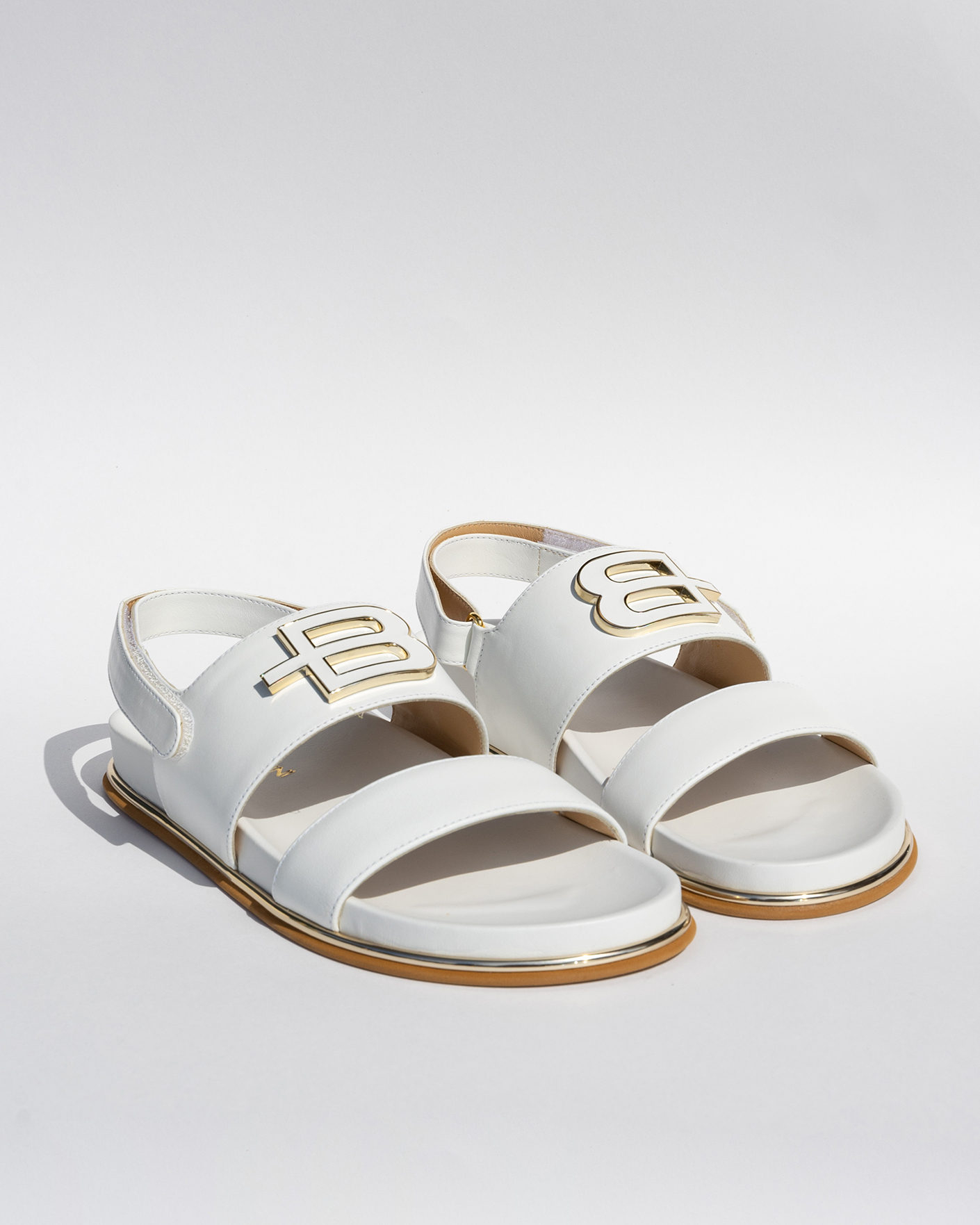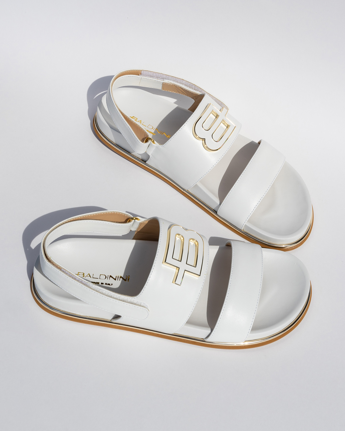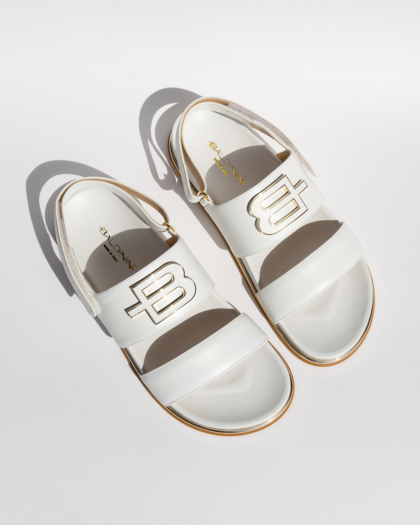 Cандалии Baldinini белого цвета с логотипом бренда. Модель с застежкой через пятку на липучке. Мягкие, легкие, удобные сандали на каждый день в жаркую погоду.