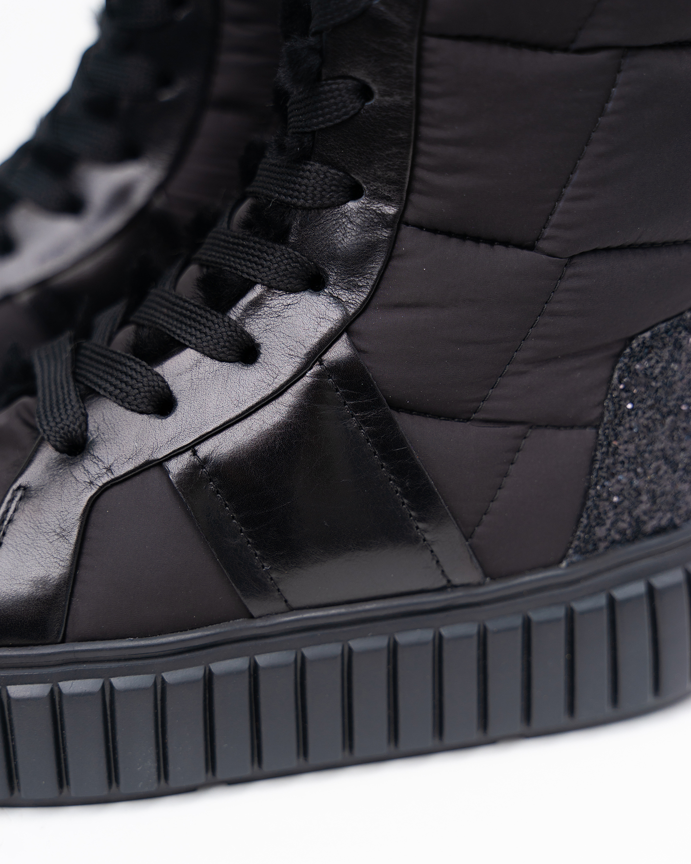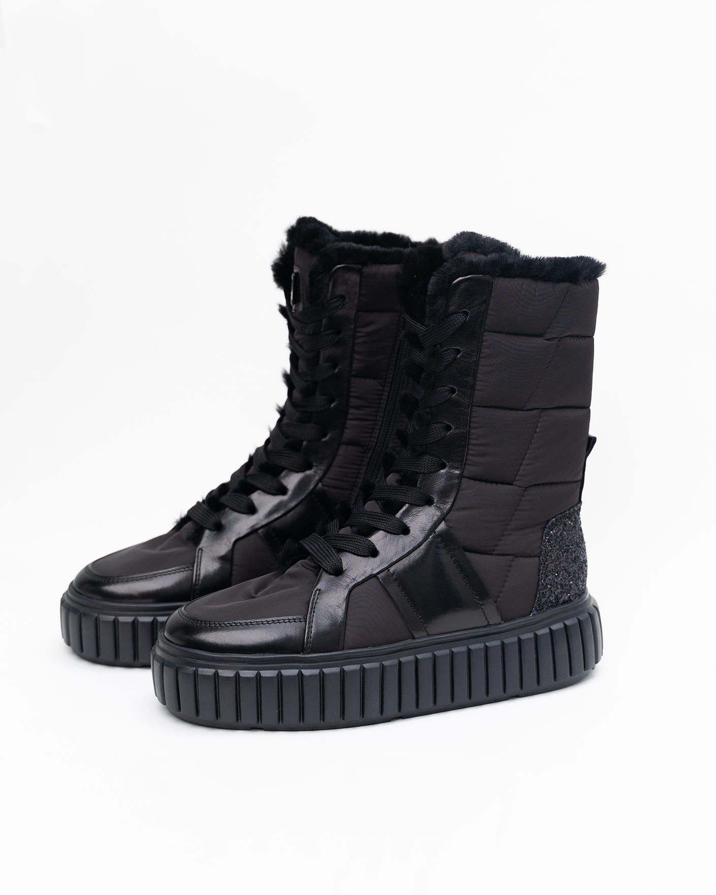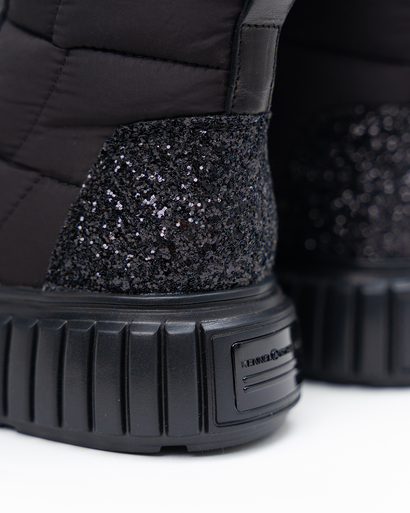 Стеганые ботинки Kennel&Schmenger черного цвета выполнены из комбинированных текстур с декором в виде страз на пятке. Высокая модель на шнуровке, с внутренней застежкой на молнию, а также внутренняя отделка - мех, что обеспечивает комфорт и тепло. Массивная подошва устойчива к холодным условиям. Стильные и универсальные ботинки станут идеальными спутниками на каждый день.