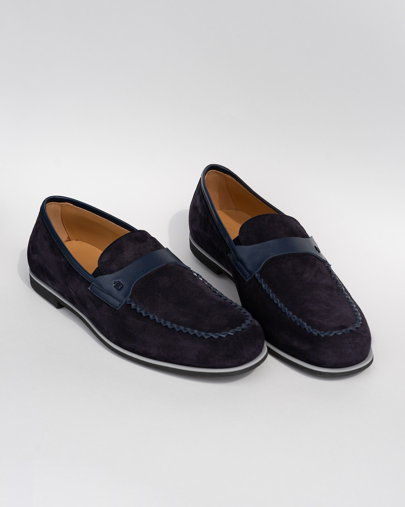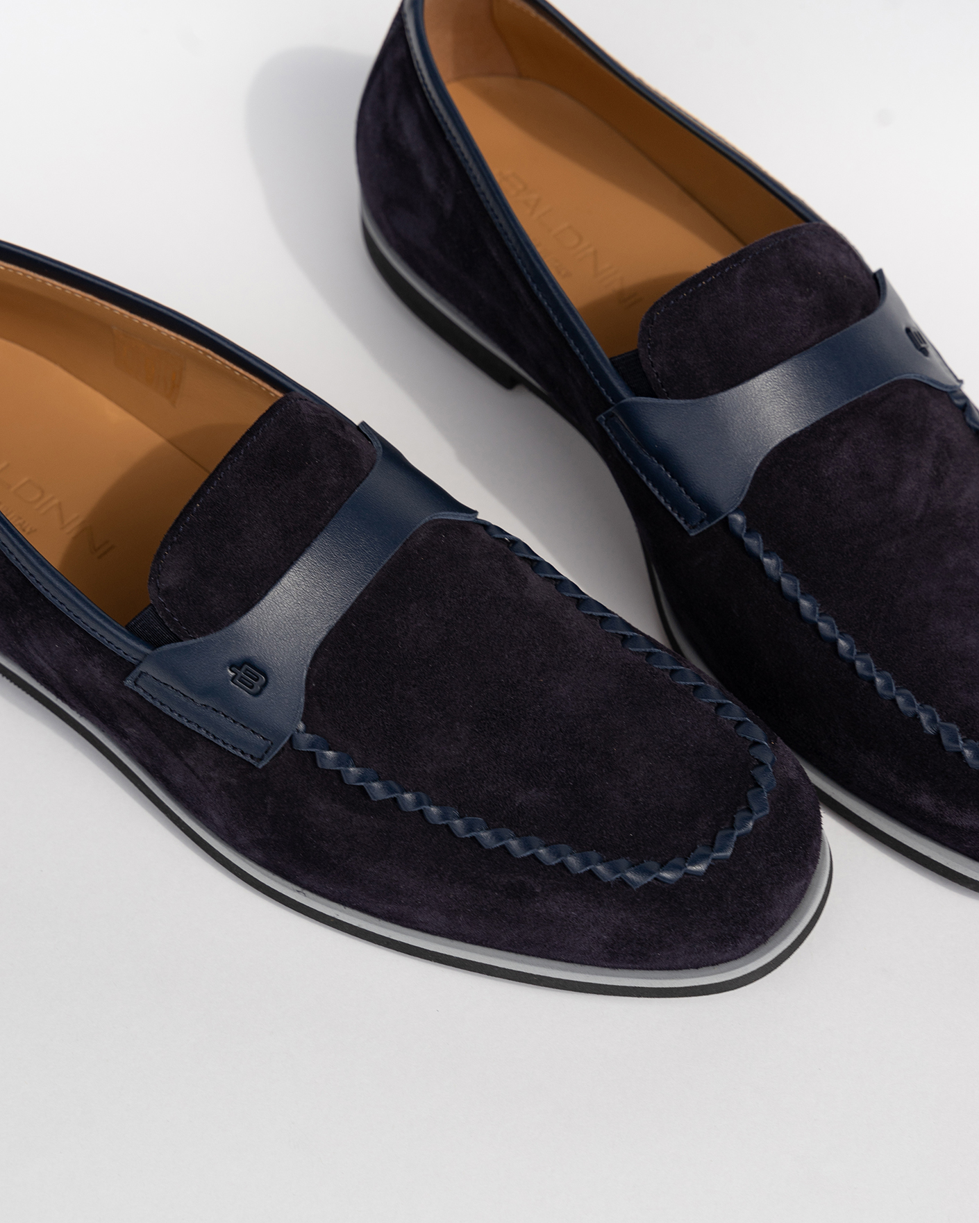 Стильные лоферы Baldinini фиолетово-синего цвета из 100% замши. Модель с кожаной строчкой по верху. Лоферы идеально подходят для элегантных образов.